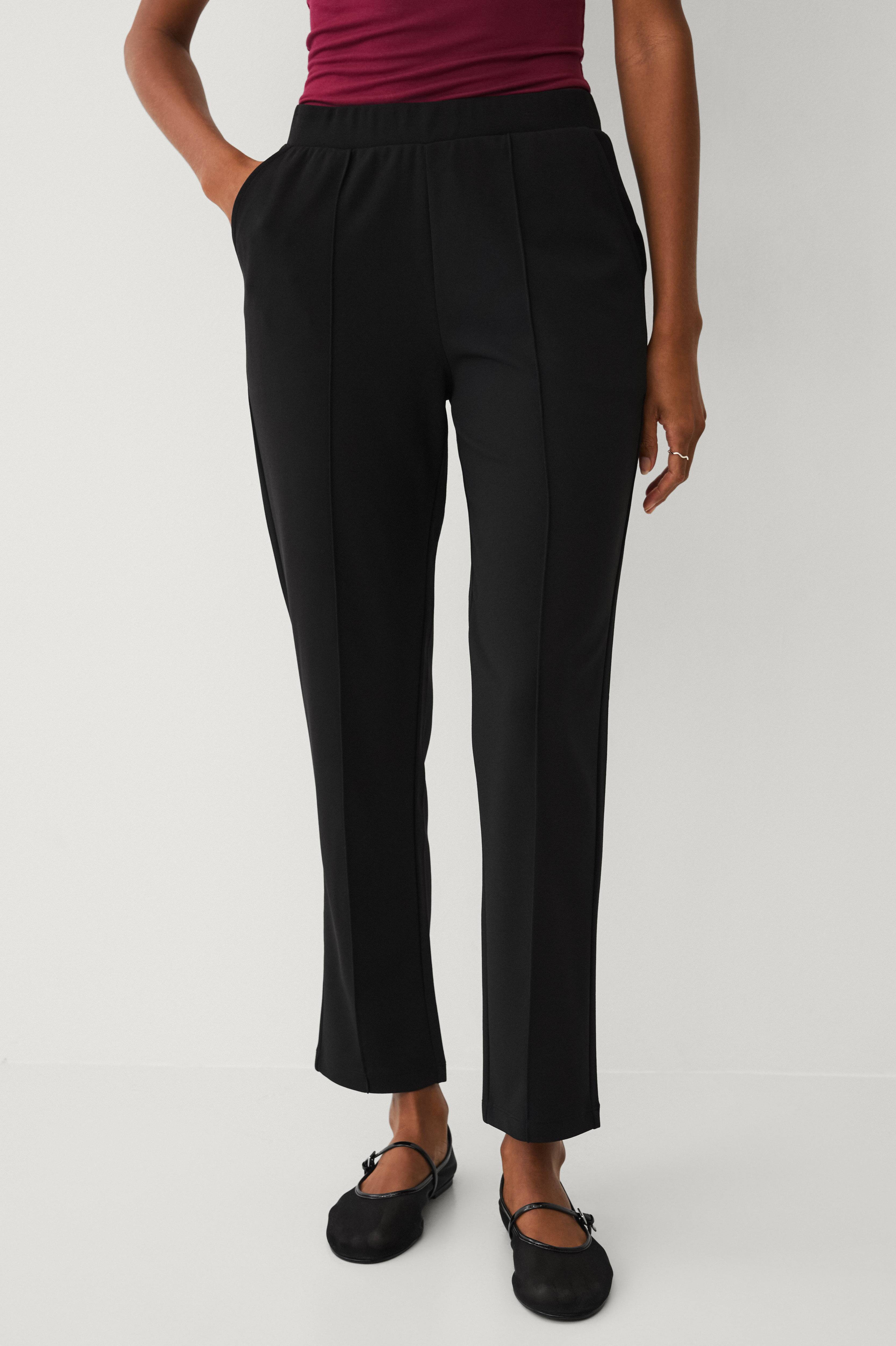 • Stretchiga byxor med avsmalnande ben• Elastisk midja• Sidfickor• Sydda veck fram• Beninnerlängd: 71 cm i storlek S