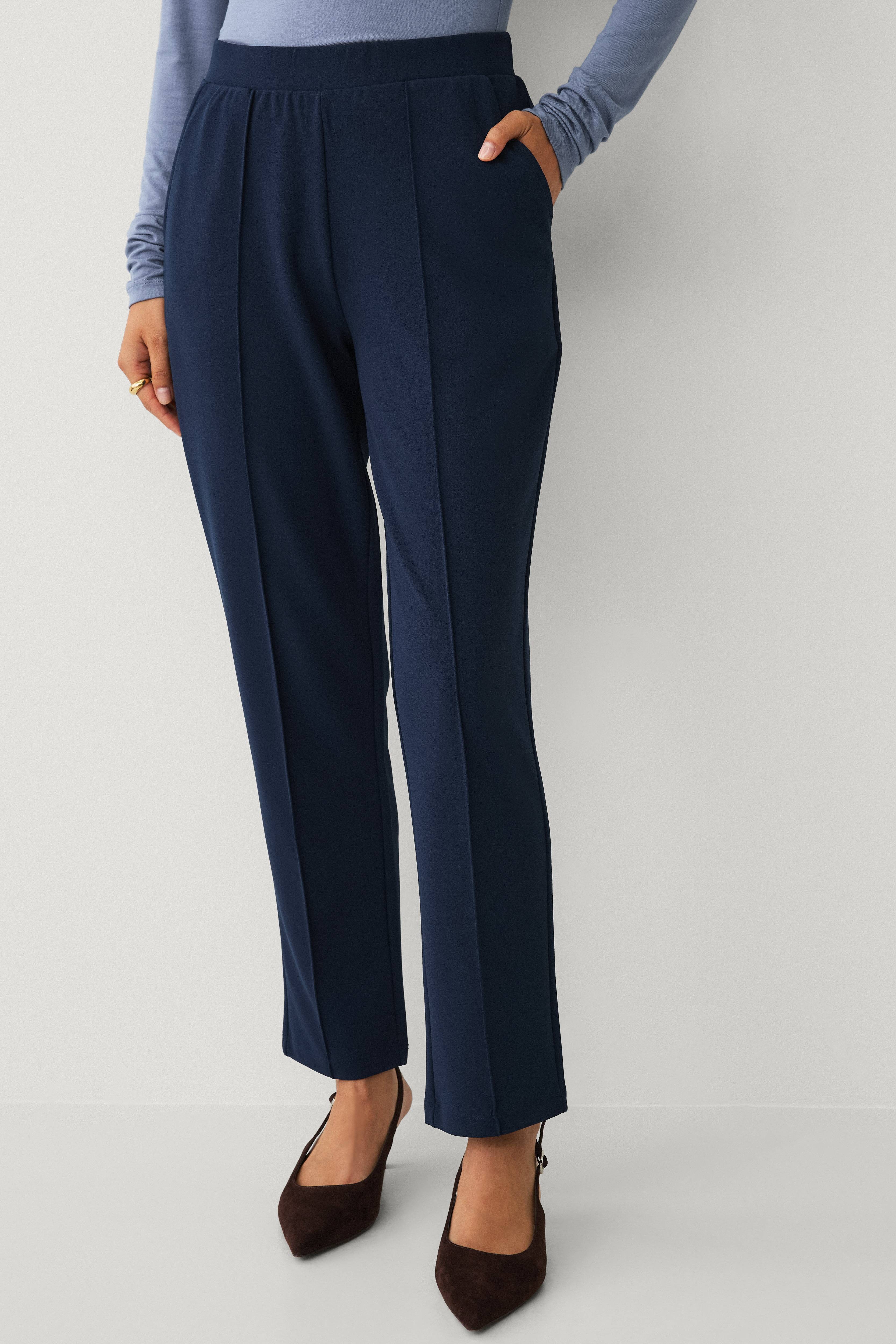 • Stretchiga byxor med avsmalnande ben• Elastisk midja• Sidfickor• Sydda veck fram• Beninnerlängd: 71 cm i storlek S