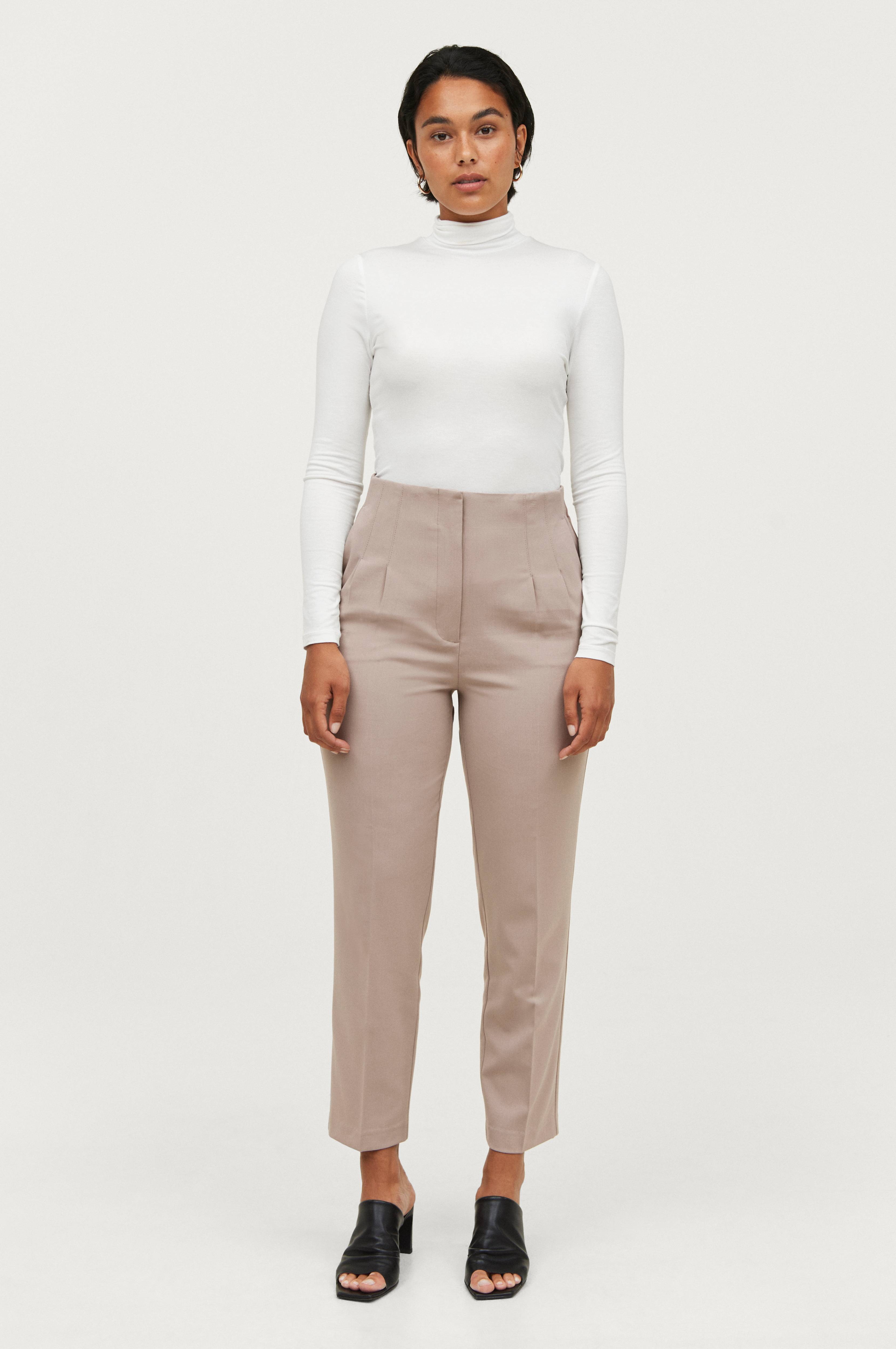 Byxor Rita med hög midja och ankellånga, avsmalnande ben med pressveck, lagda veck i midjan fram och fickor i sidorna. Bred, invändig resår i midjan och gylf med dragkedja och hyska och hake.