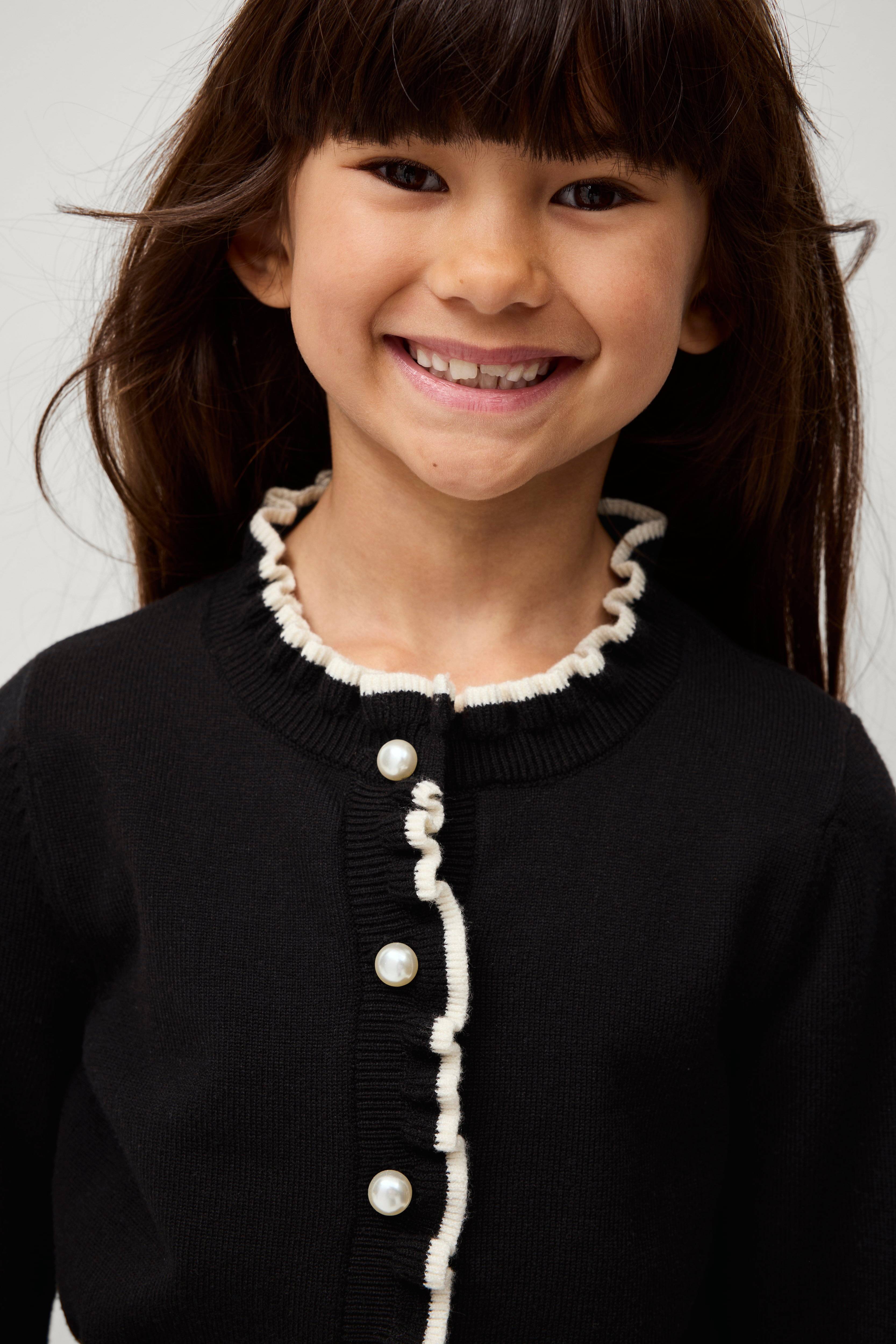 • Ribbstickning i ärmsluten och nedtill med små volangkanter