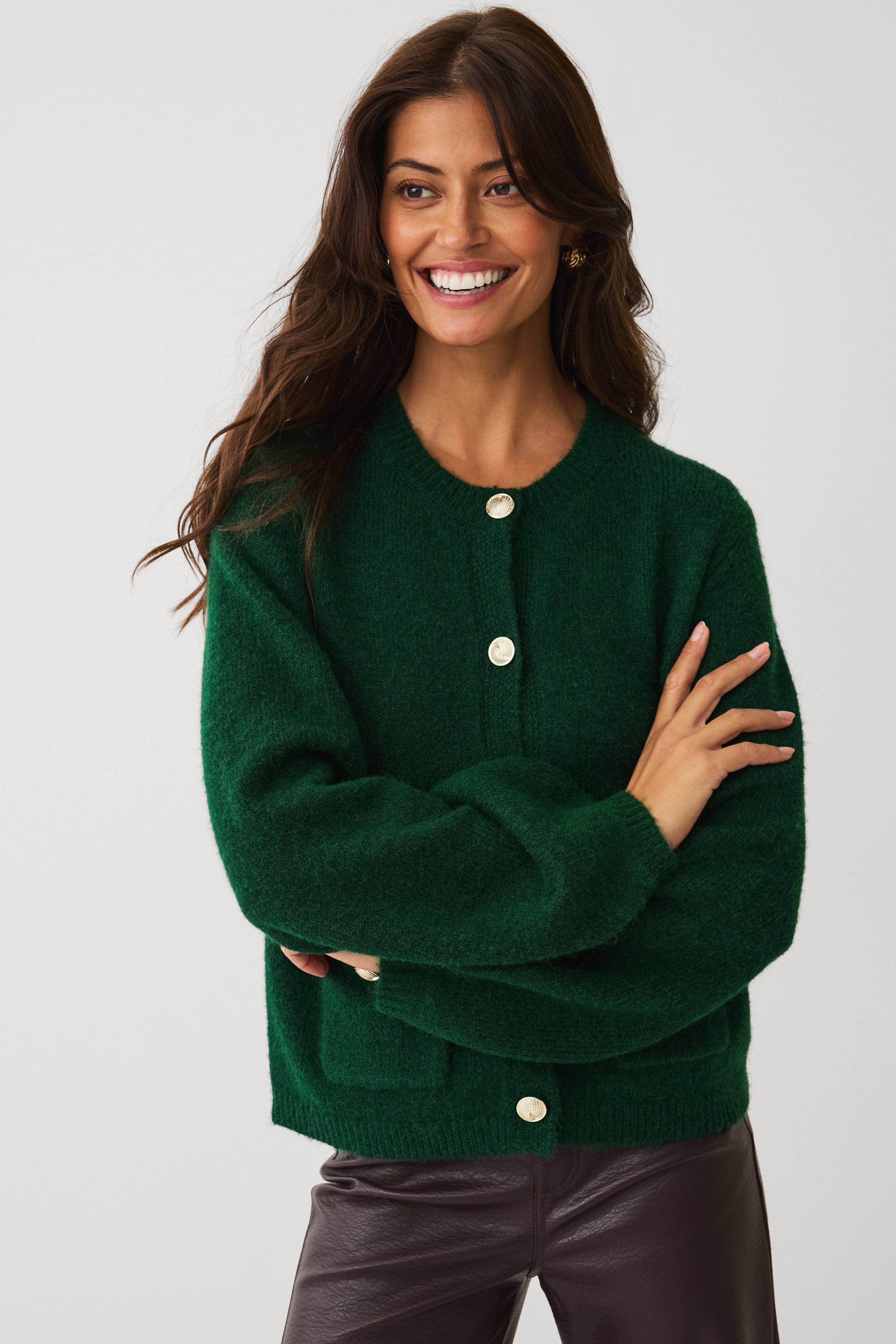 • Finstickad cardigan med lång puffärm• Rundad, ribbstickad halsringning• Stängning fram med guldfärgade, dekorativa knappar• Ribbstickning i ärmsluten och i nederkanten• Två fickor fram med dekorativ, guldfärgad knapp• Längd: 53 cm i storlek S