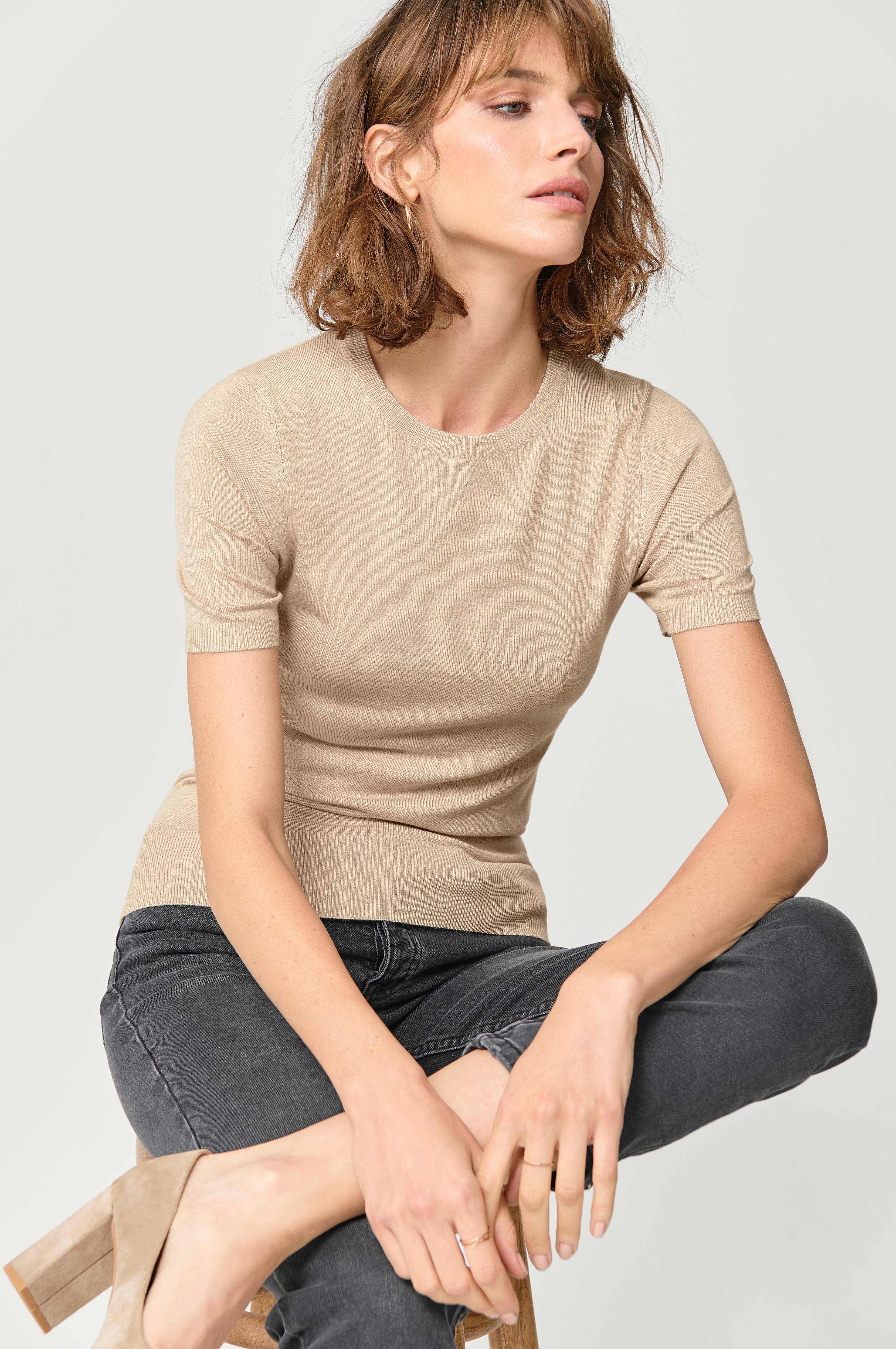 Topp Celia i finstickad modell med rund hals som har ribbstickad kant och knappslå med metalltryckknappar i nacken. Kort ärm med ribbstickning i ärmslut och ribbstickning även i nederkanten. Längd ca 63 cm i stl 34/36.