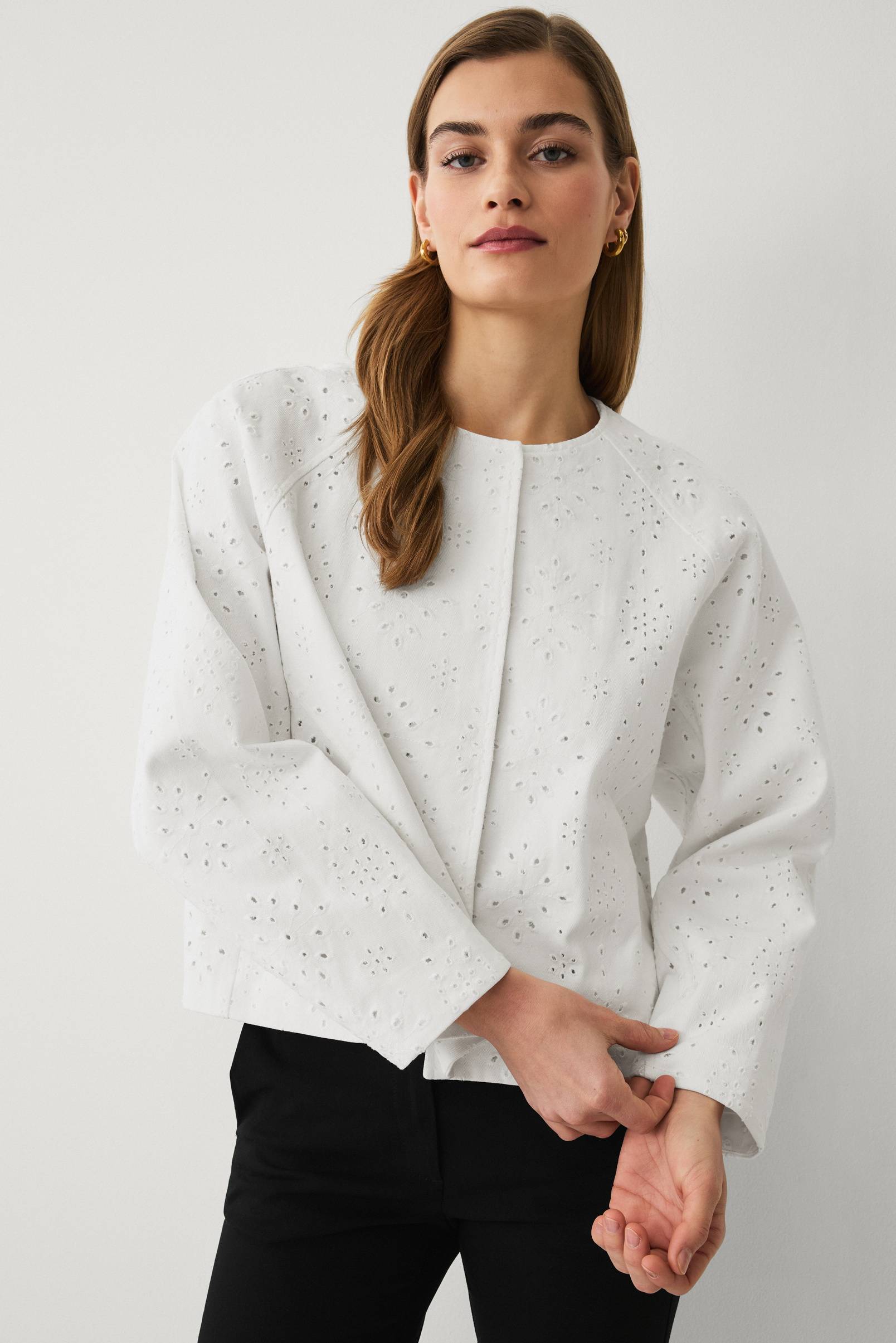 • Jacka i bomull med dekorativa hålbroderier runt hela• Rund halsringning• Dolda tryckknappar fram• Långa, vida ärmar• Sidfickor• Längd: 55 cm i storlek S