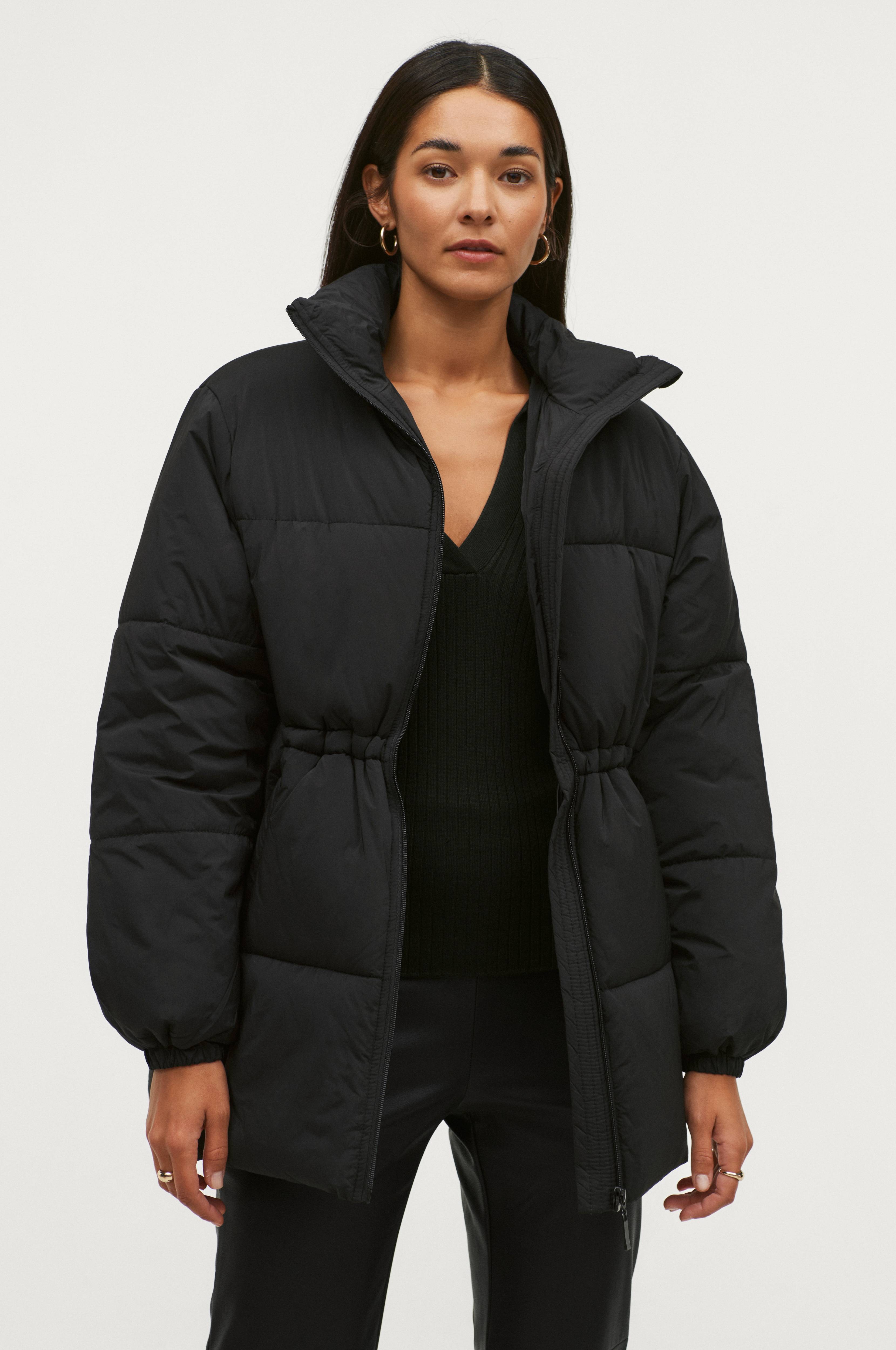 Vadderad jacka med justerbar midja med invändig dragsko. Fleecefodrade fickor fram och resår i ärmsluten. Vaddering och foder av återvunnet material. Längd ca 75 cm i stl 34/36.