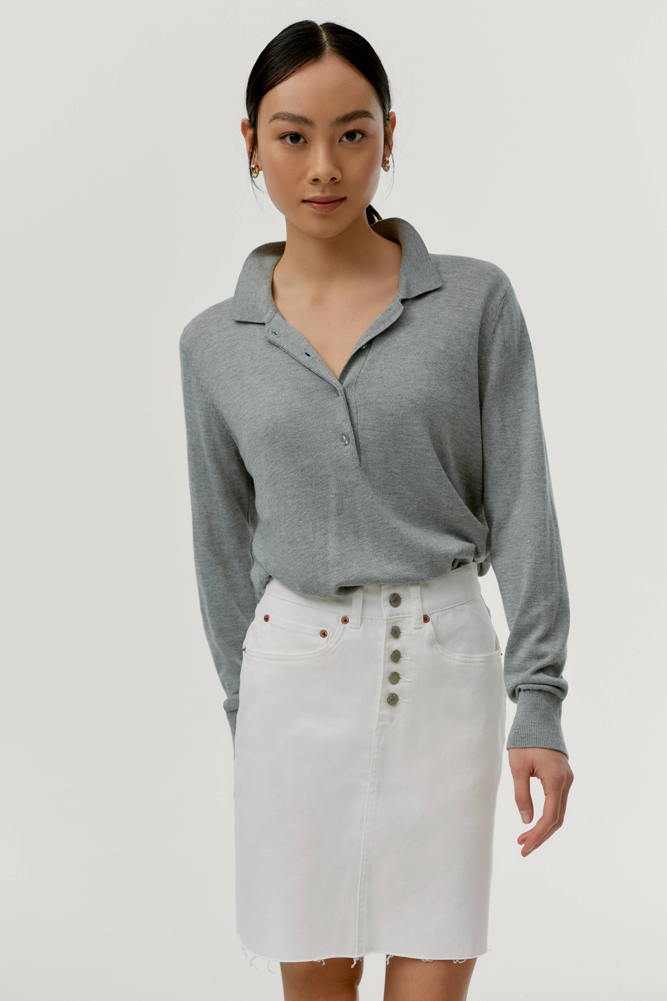 Jeanskjol i stretchdenim. Rak femficksmodell med hög midja och rå nederkant. Gylf med knappar. Längd ca 47 cm i stl 36.