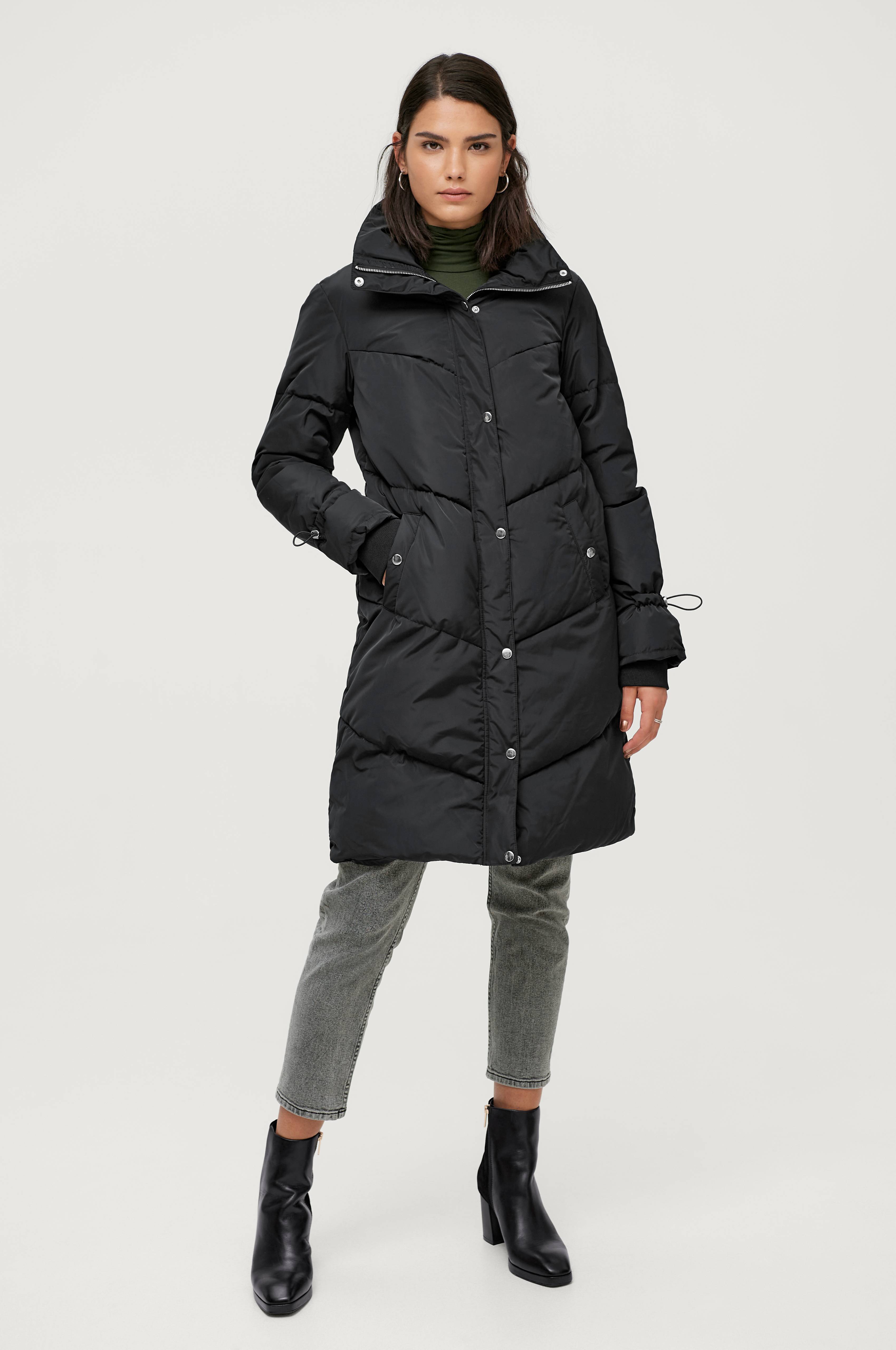 Kappa Ida i lång, vadderad modell med fin quiltstickning. Knappslå med dold tvåvägsdragkedja och tryckknappar samt riktigt hög krage. Två infällda fickor med tryckknapp och elastisk dragsko med stopper nertill på ärmen samt ribbstickad mudd i ärmslut. Längd bak ca 98 cm i stl 36.