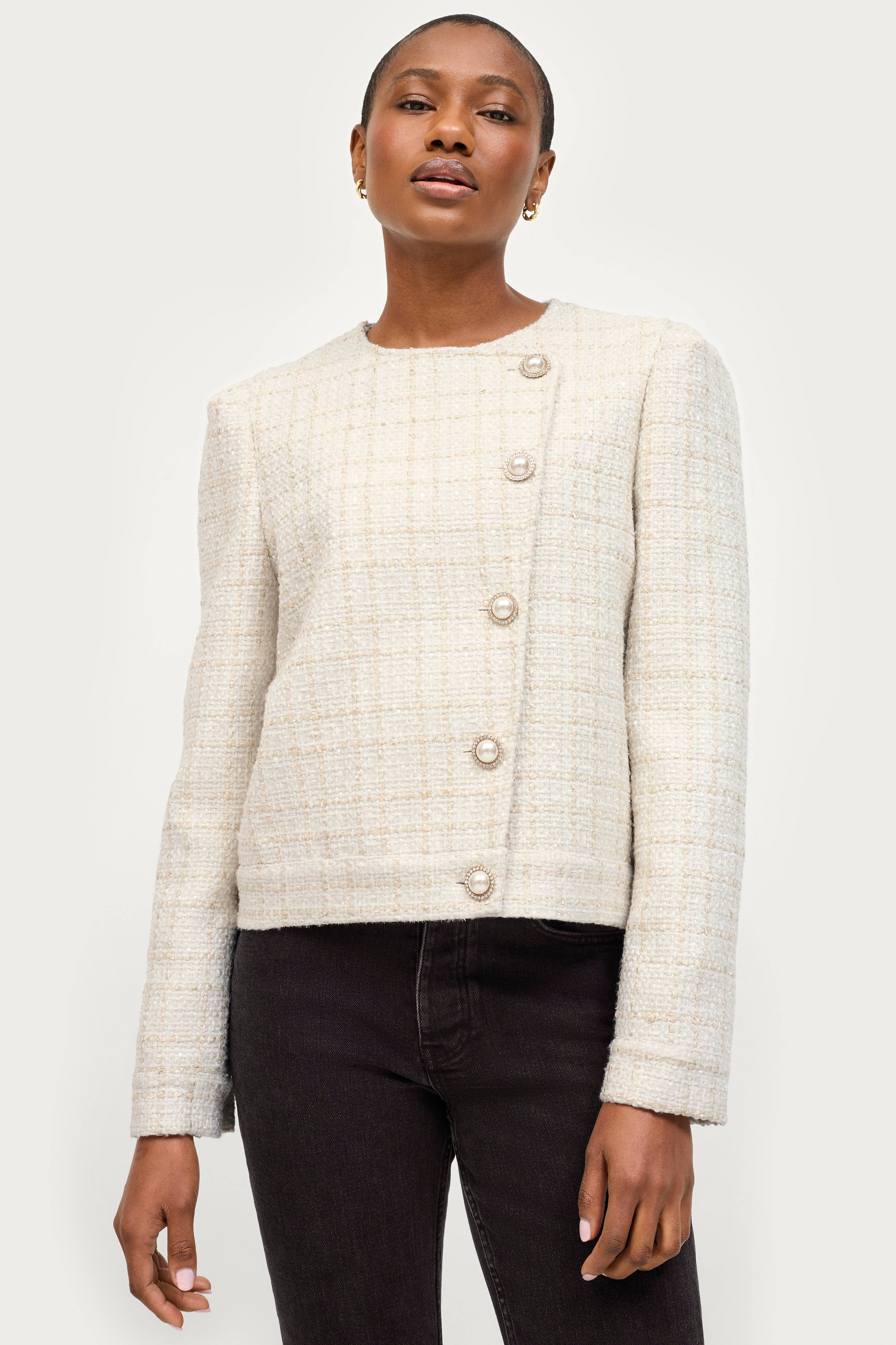 • Asymmetrisk knäppning med pärlknappar med strass• Veck på axlarna• Strukturerad kvalitet med skimrande tråd• Vävt foder• Längd: 52 cm i storlek 36
