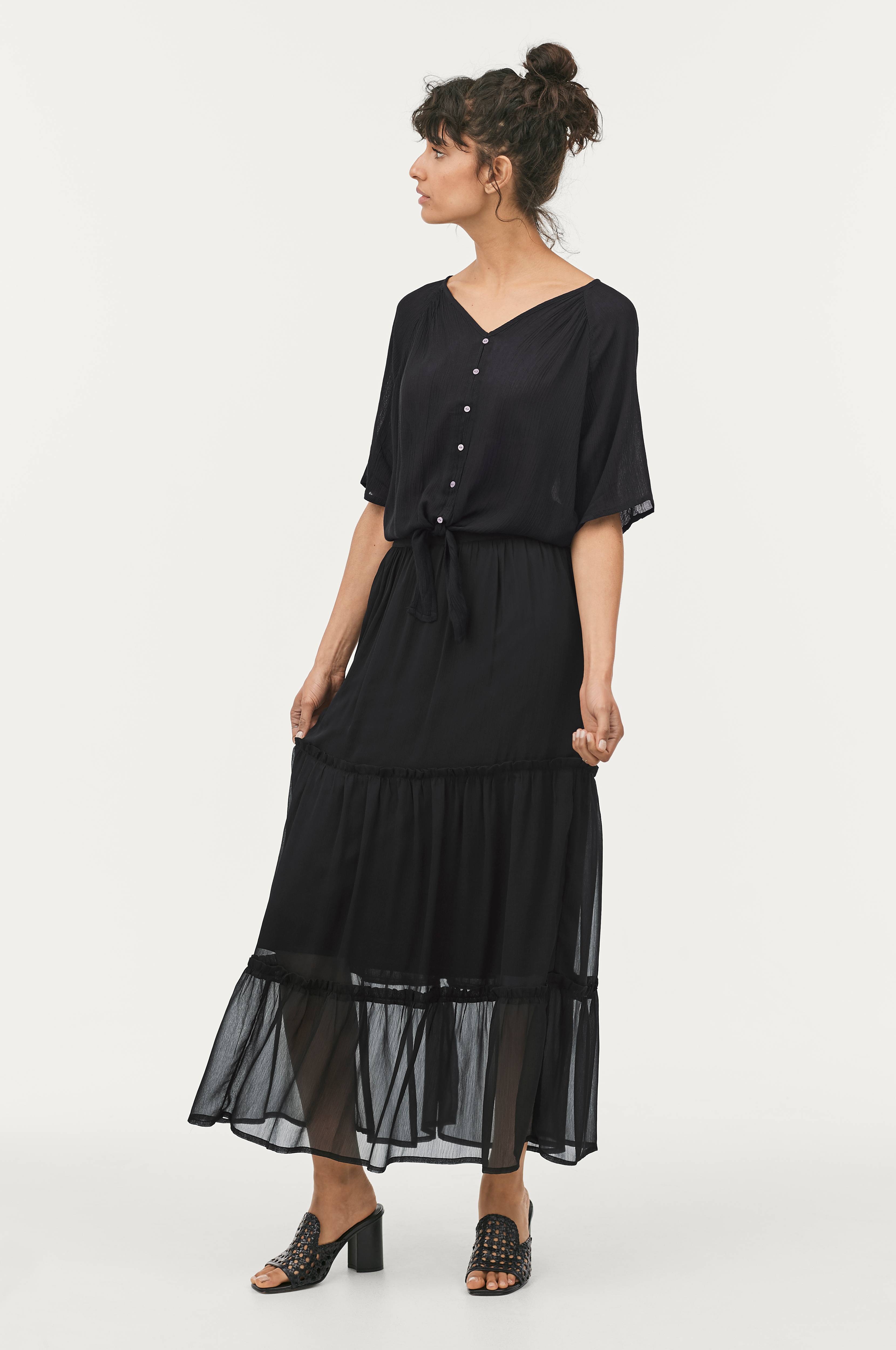 Kjol Cornelia i lång modell med härlig vidd och romantiska volanger. Midjan är stum framtill och har resår baktill. Gjord i chiffong med krinklad struktur med kortare trikåfoder. Längd ca 95 cm i stl 36.