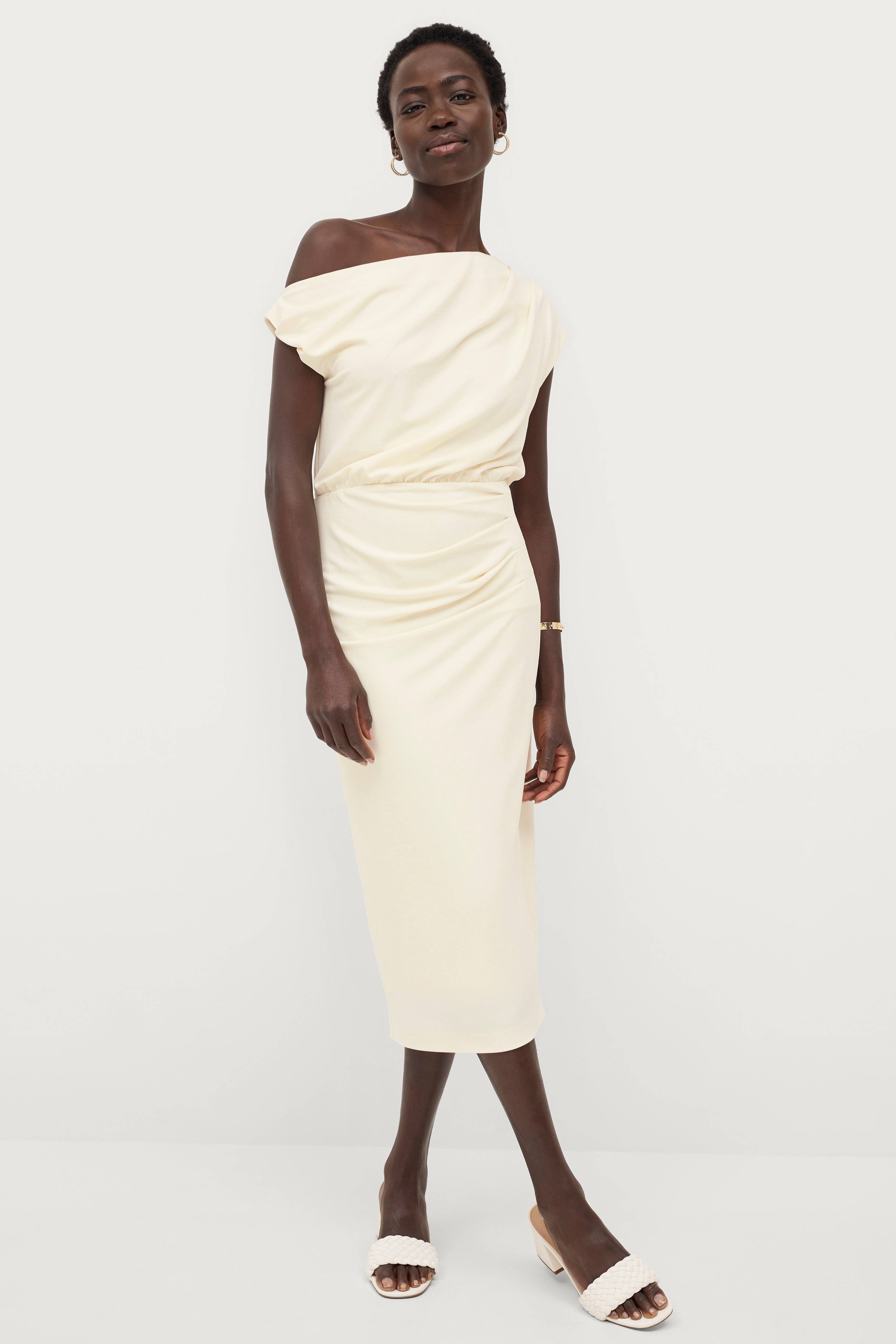 • Figurnära klänning i jersey• Draperad halsringning• Veck i sidan• Elastisk midja• Slits nedtill bak• Trikåfoder• Längd: 111 cm i storlek 36
