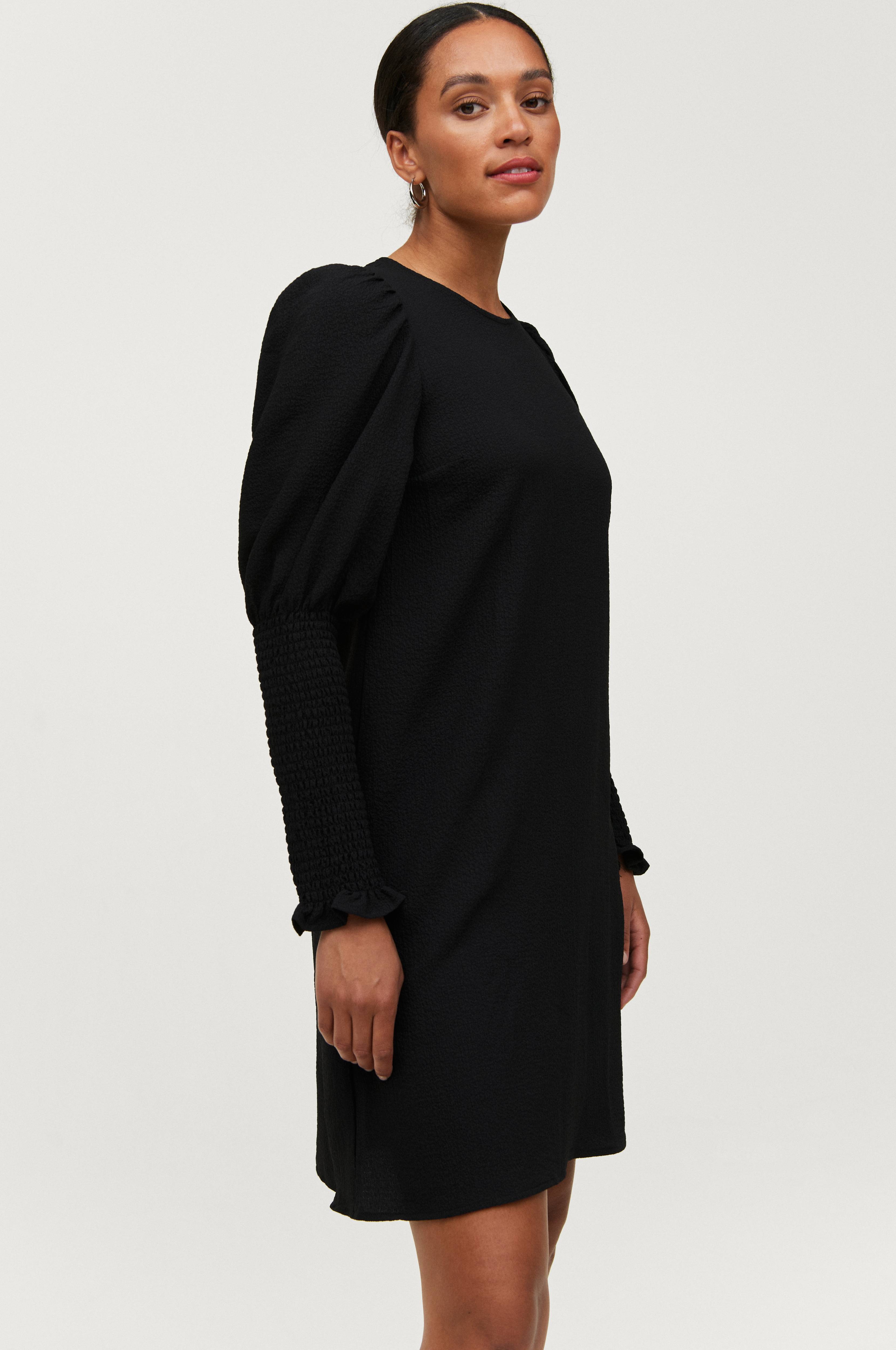 Klänning med långa puffärmar med vidd upptill och smal underärm i smock. Rund hals med sprund och knapp bak. Gjord i vävd kvalitet med kräppad struktur. Längd ca 93 cm i stl 34/36.