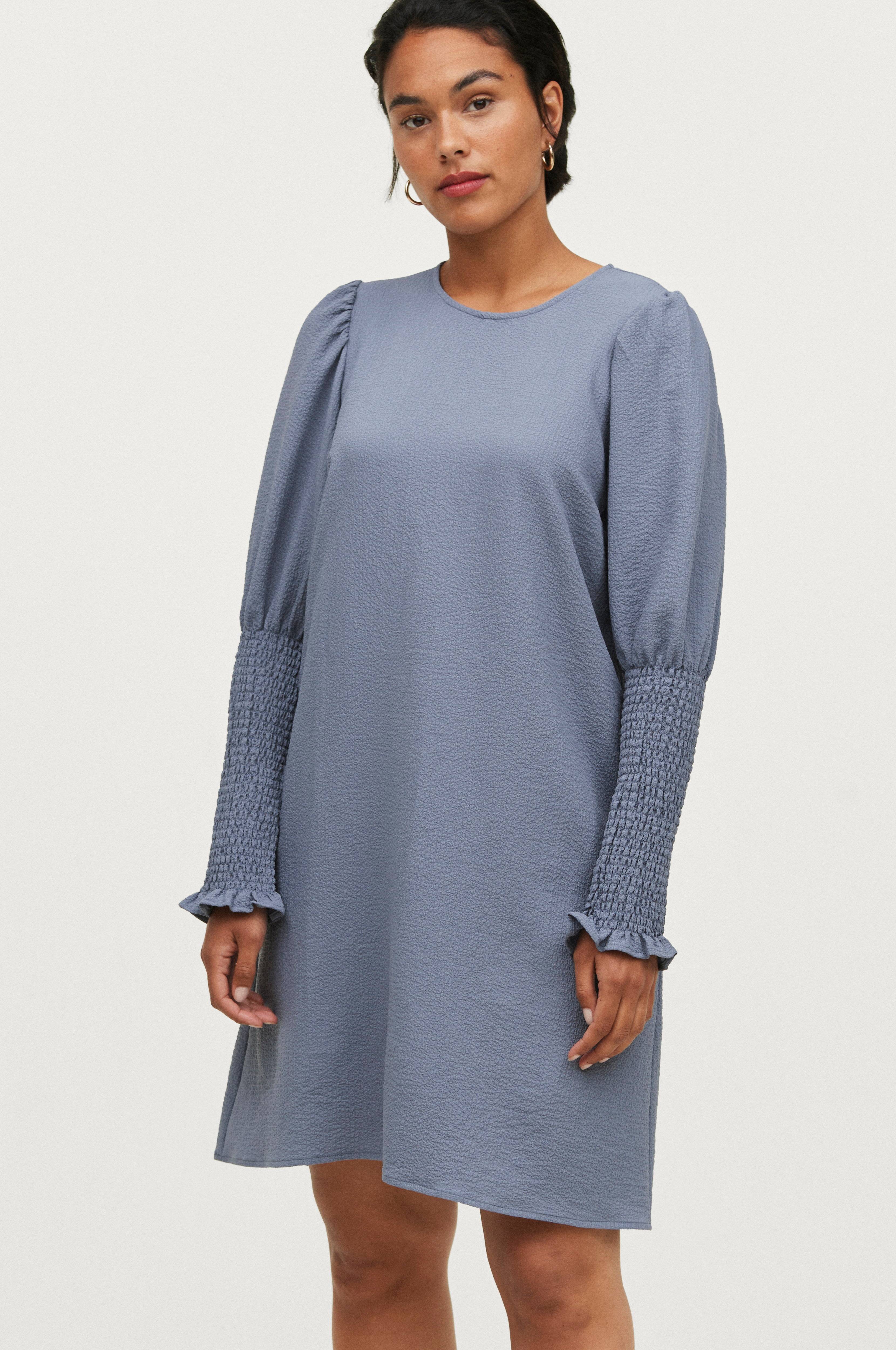 Klänning med långa puffärmar med vidd upptill och smal underärm i smock. Rund hals med sprund och knapp bak. Gjord i vävd kvalitet med kräppad struktur. Längd ca 93 cm i stl 34/36.