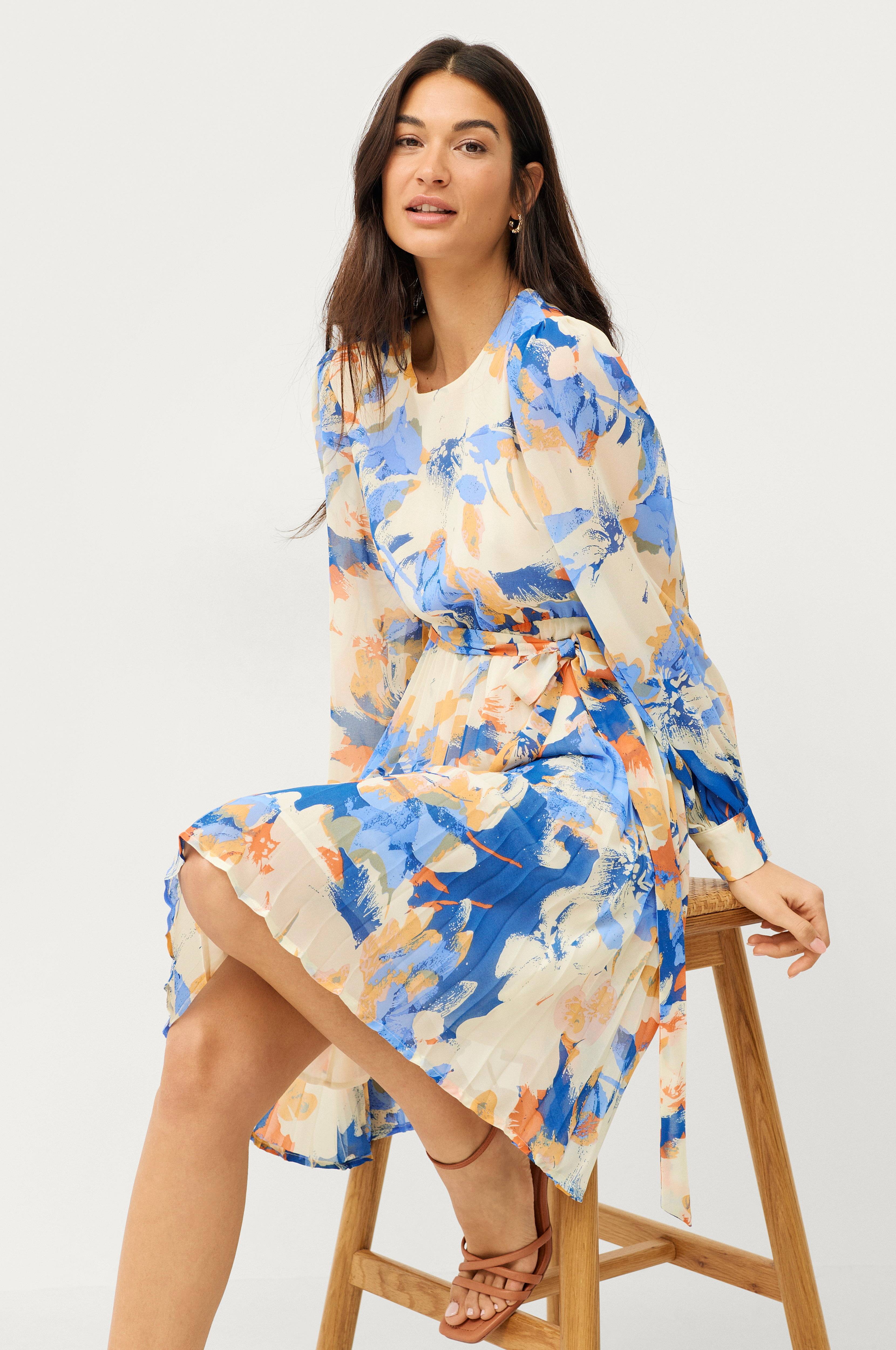 • Utsvängd modell• Plisserad kjol• Sprund med knapp i nacken• Ballongärmar med manschett• Elastisk midja med knytskärp• Gjord av chiffong• Tunt foder• Längd: 97 cm i storlek 34/36