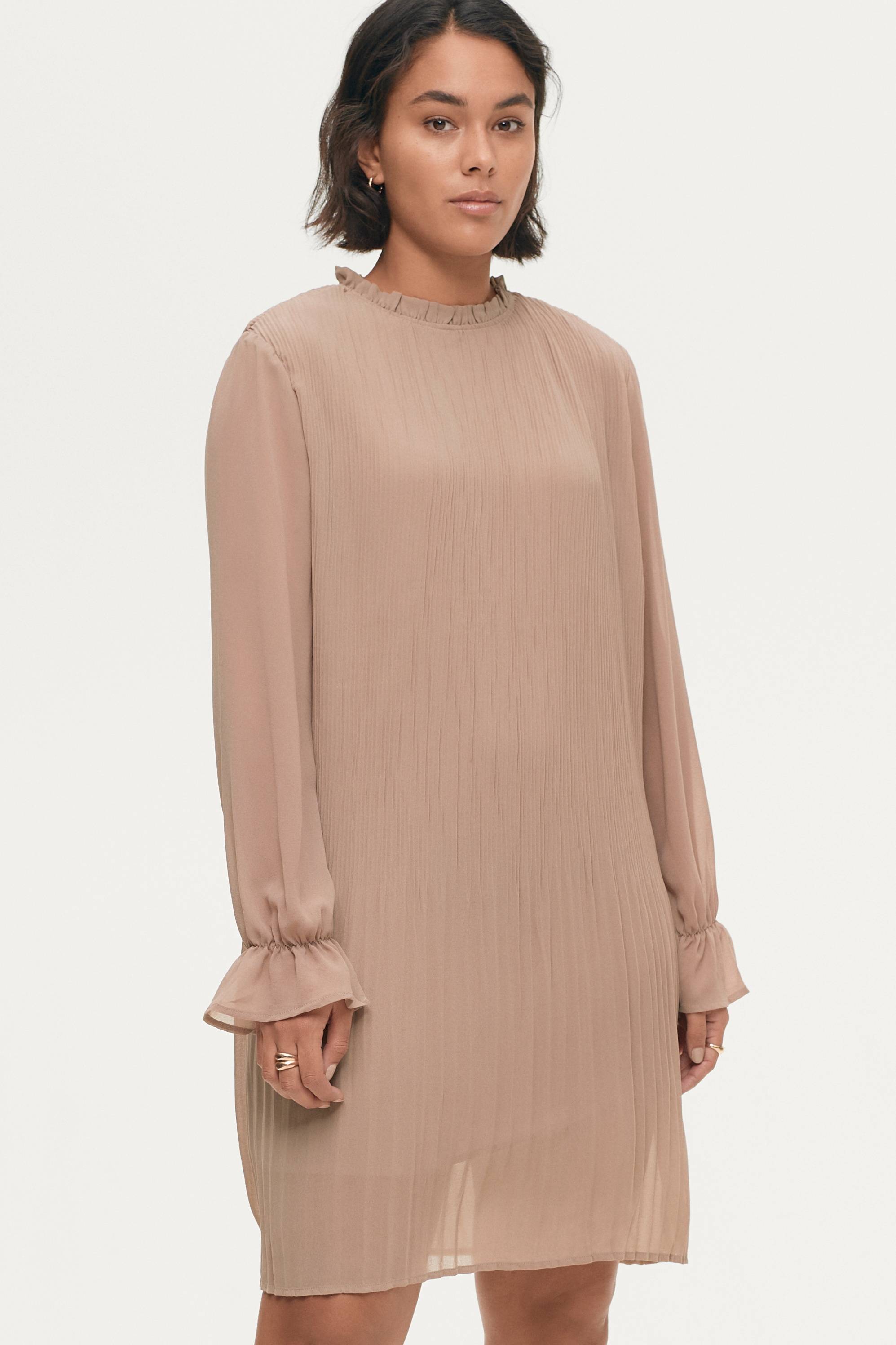 Klänning Felia i rak modell med hög hals med liten volangkrage och sprund och knapp bak. Lång ärm med resår och volang i ärmslut. Gjord i plisserad chiffong med smalare veck upptill. Fodrad i chiffong. Längd ca 98 cm i stl 38