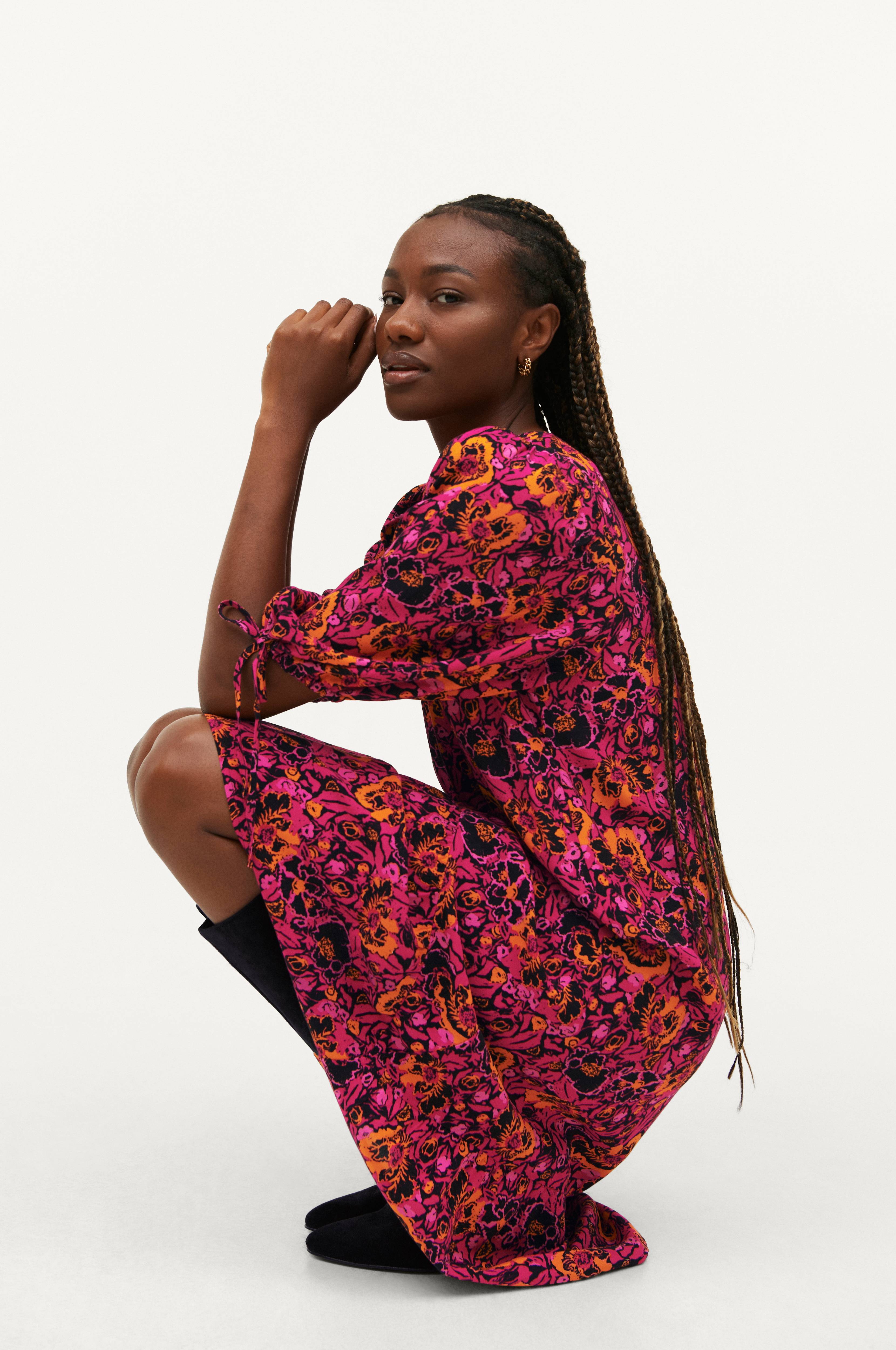 • Utsvängd modell • Bred volang nedtill • Rund hals med en knapp i nacken • Vid, 3/4-lång puffärm med dragsko i ärmsluten • Längd: 103 cm i storlek 34/36