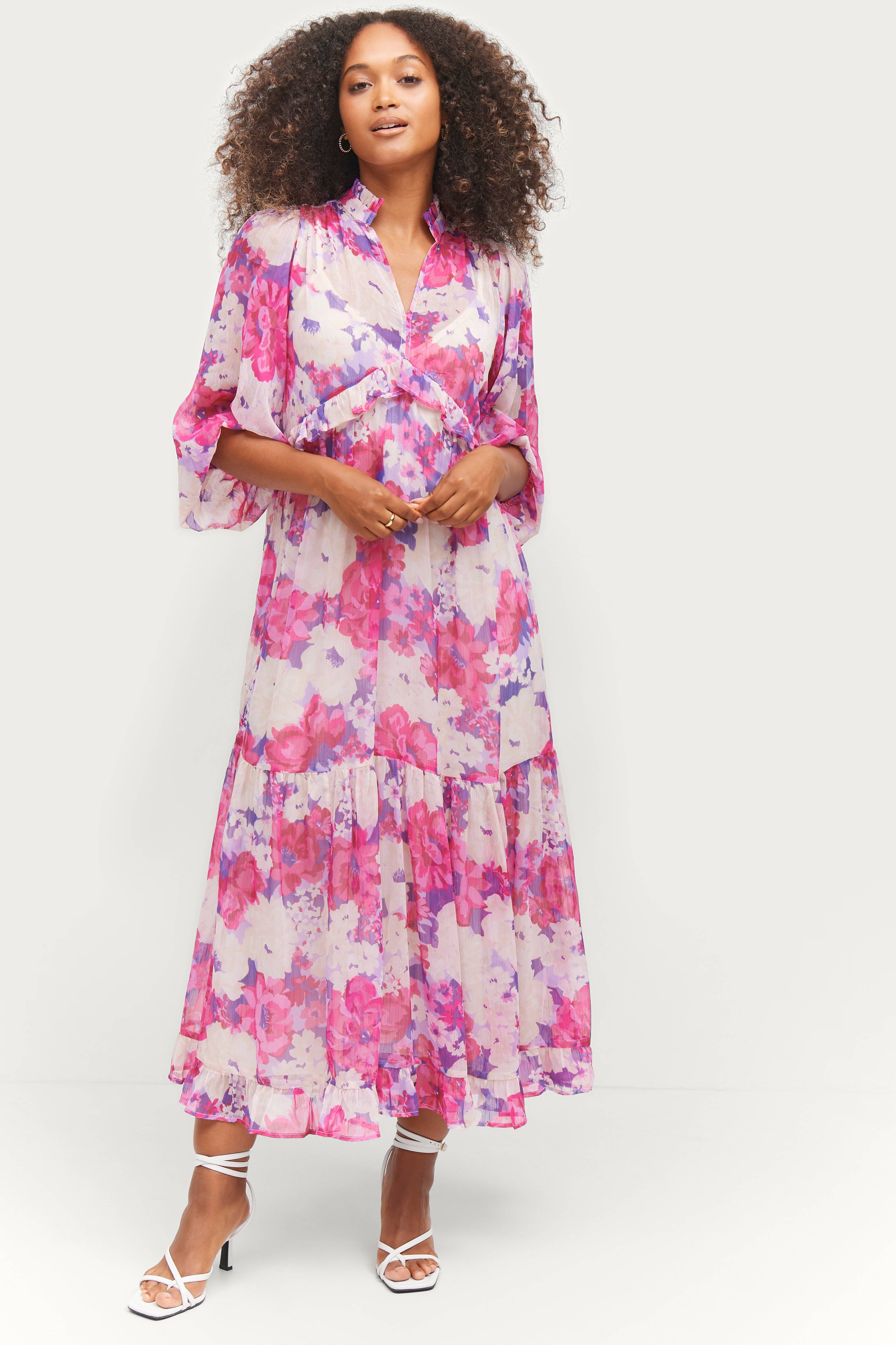 • Klänning i chiffong • V-ringning • Volang i halsen, vid bysten och nedtill • 3/4-långa ballongärmar • Underklänning i trikå • Längd: 128 cm i storlek 34/36 • Produkten innehåller återvunnet material som har tagits tillvara för att minska mängden avfall, samtidigt som nya resurser inte har förbrukats.