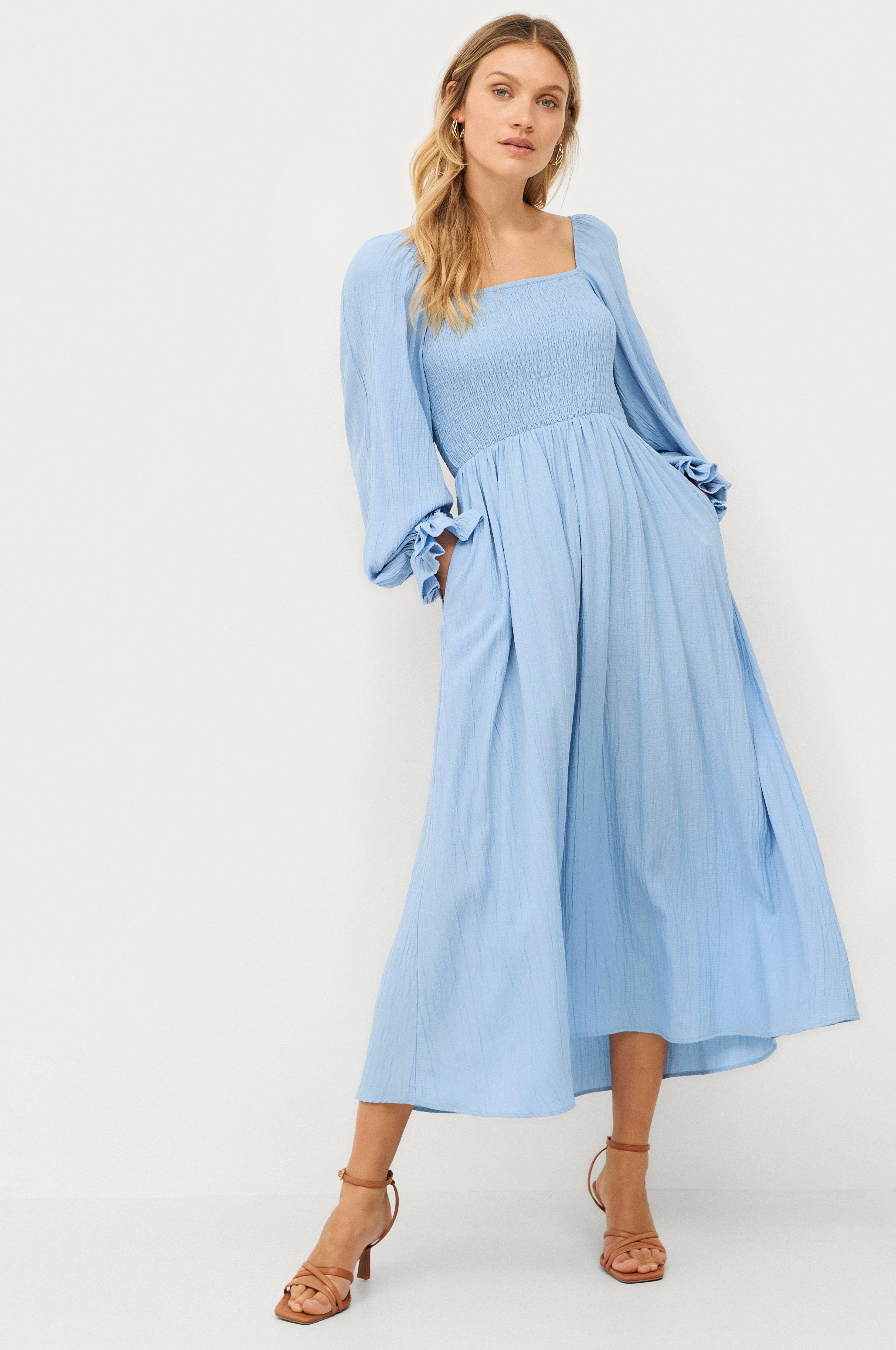 Klänning i viskosmix med randstruktur i tyget. Fyrkantig, elastisk halsringning. Vida ballongärmar med resår i ärmsluten. Smockad upptill fram och bak. Längd ca 128 cm i stl 34/36.