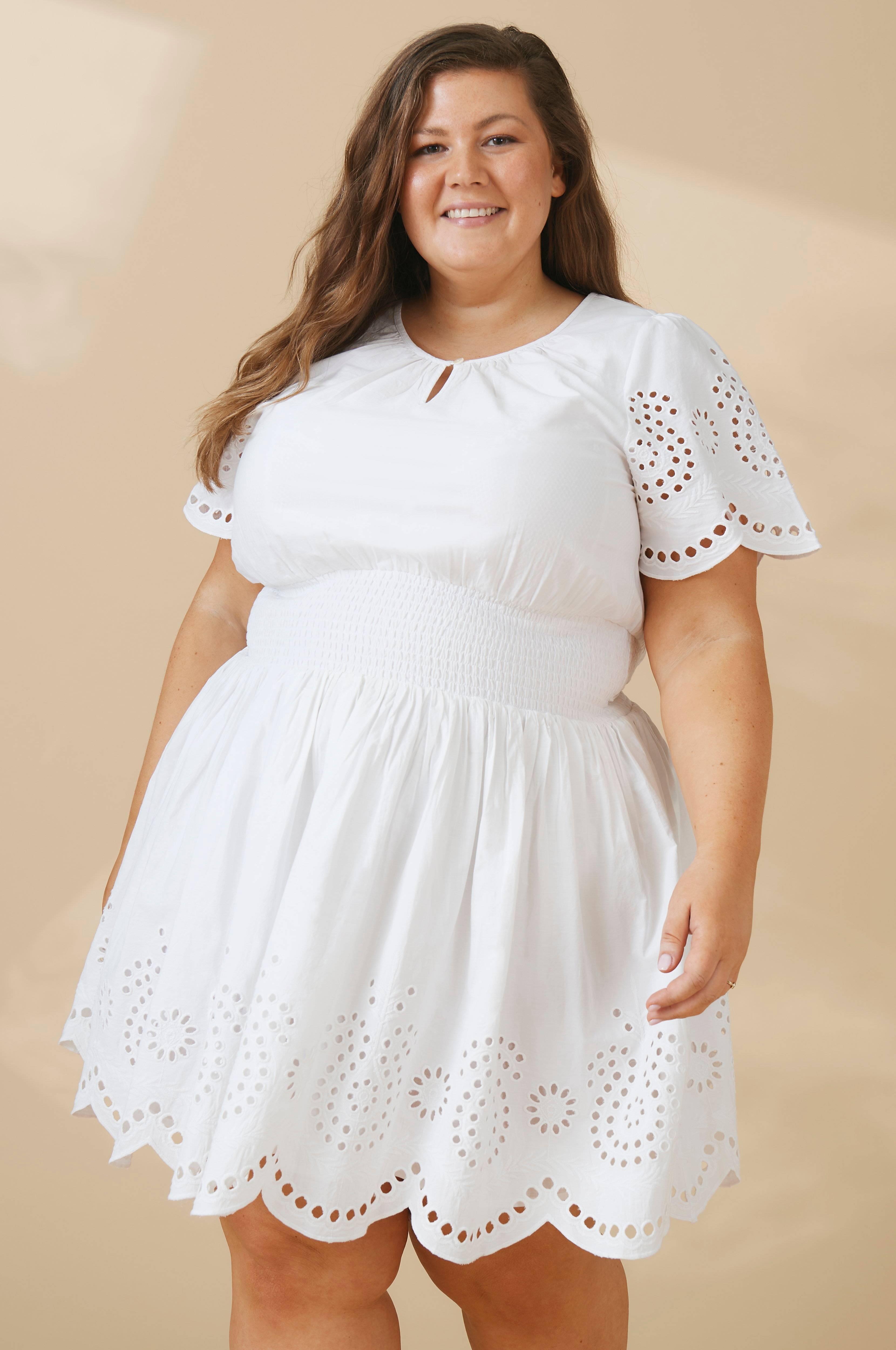 Lätt figurformad modell med bred, elastisk smock i midjan. Rund hals med rynk och knapp mitt fram. Kort, vid ärm med hålbroderier samt hålbroderier nertill på kjolen. Kjolen är fodrad.