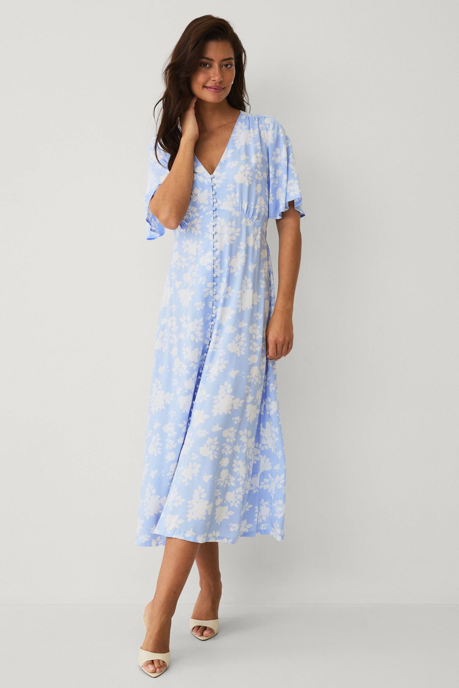 • Midiklänning med v-ringad hals• Korta fjärilsärmar• Klädda knappar hela vägen fram• Avskärning i midjan med invändig resår bak• Längd: 127 cm i storlek 38