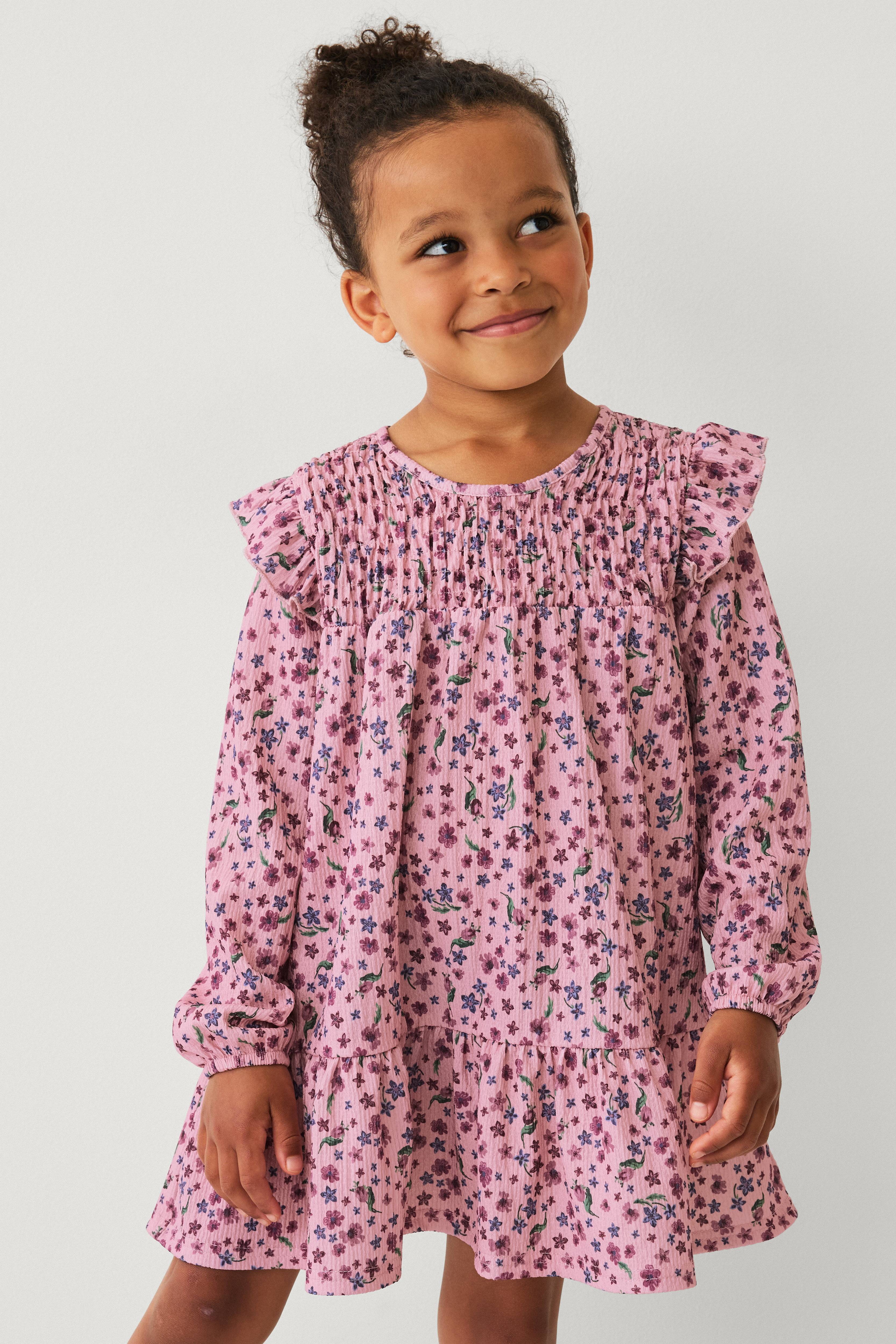 • Klänning med volanger• Smock upptill• Rund halsringning• Långa ärmar• Resår i ärmsluten• Normal passform