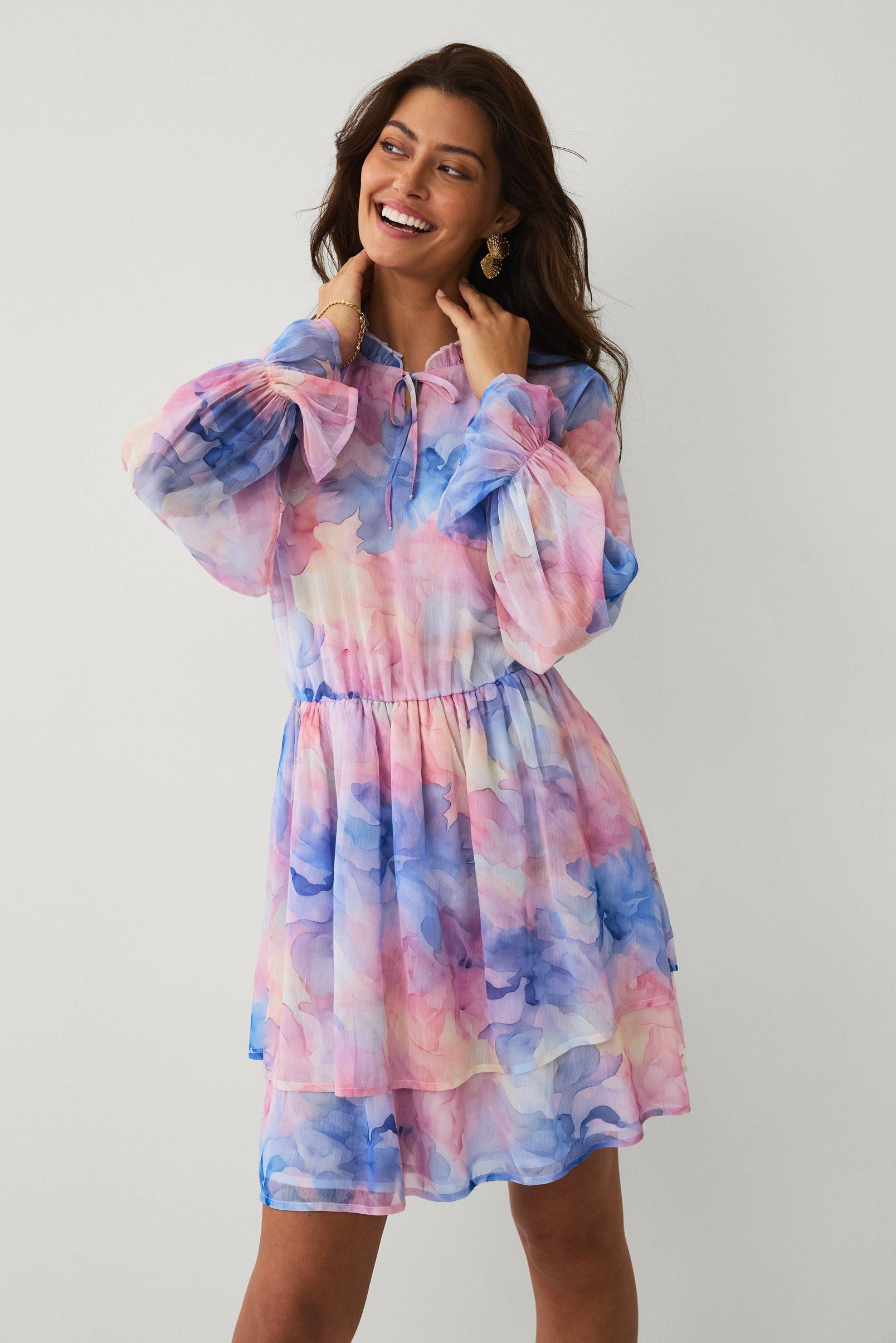 • Klänning i chiffong• Rund halsringning med volangkrage och sprund med knytdetalj• Långa ärmar med resår och volang i ärmsluten• Elastisk midja• Volang på kjolen• Enfärgat foder i chiffong framtill och i kjolen• Längd: 92 cm i storlek S
