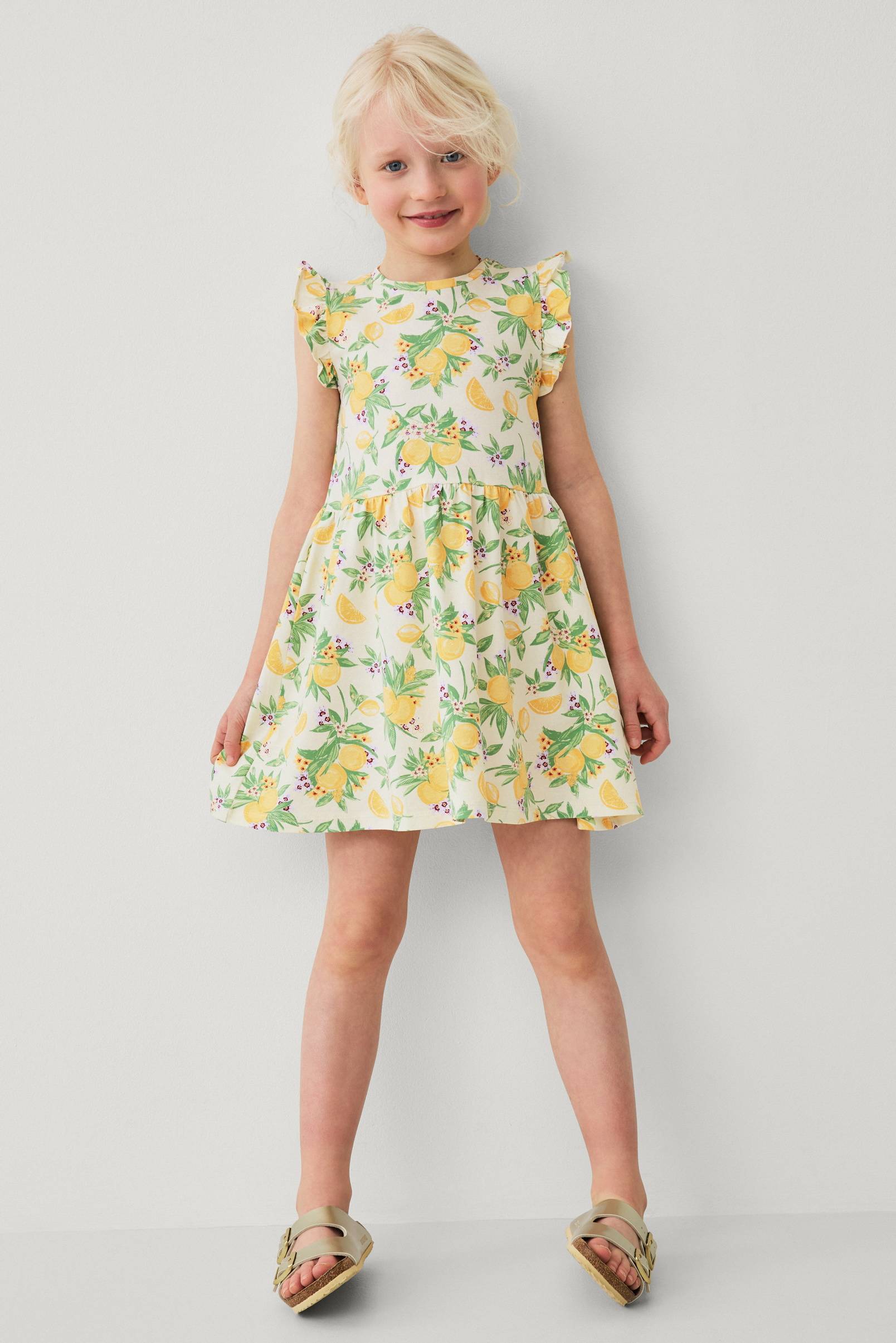 • Ärmlös klänning i bomullstrikå• Rund halsringning• Volanger över axlarna• Rynkad avskärning i midjan