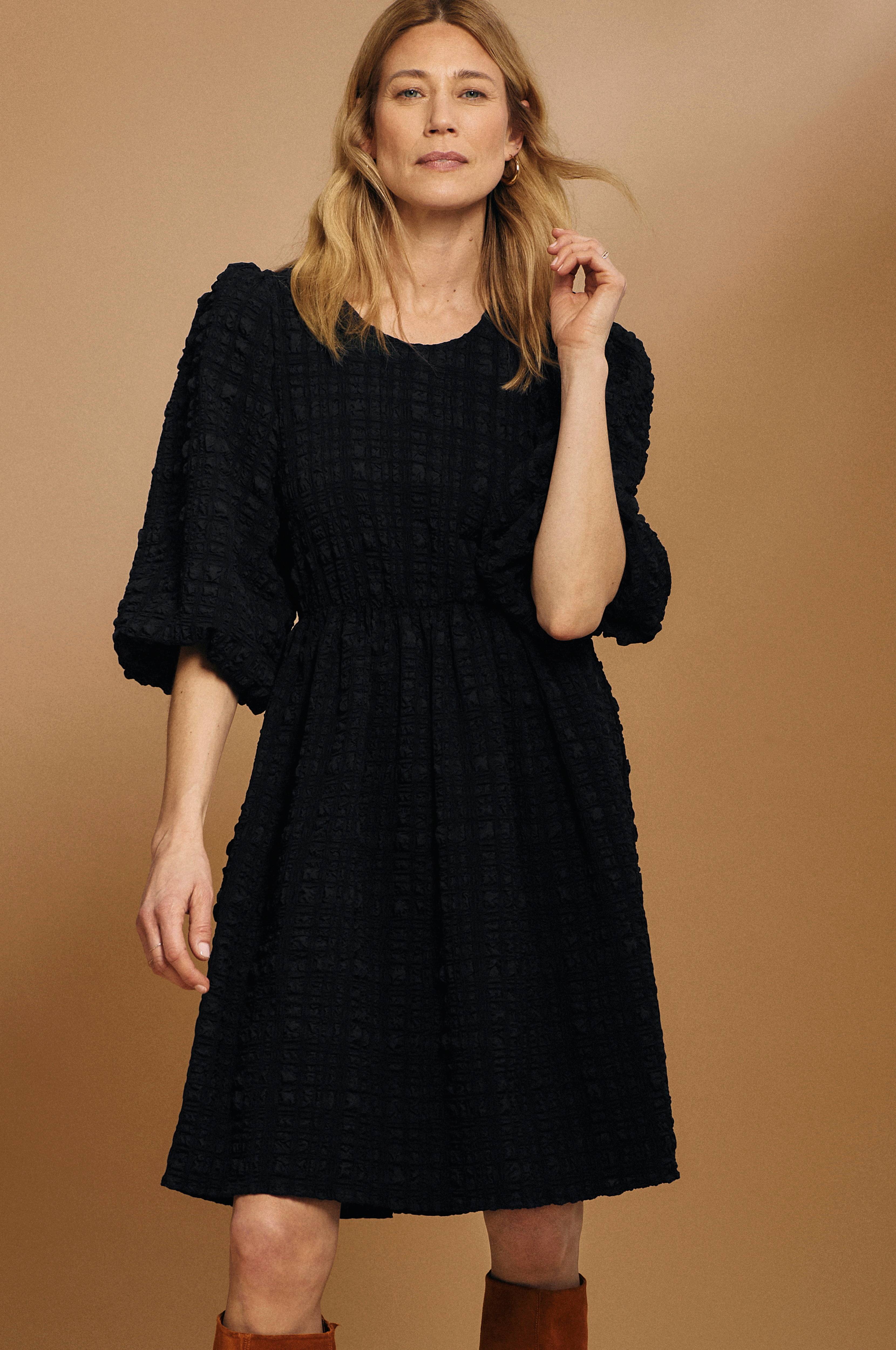 Härlig klänning i vävd kvalitet med spännande, bubblig struktur som ger viss elasticitet. 3/4-långa ballongärmar med lätt puffeffekt och öppen rygg med brett knyt i nacke och rygg. Utställd kjol. Längd ca 103 cm i stl 36.