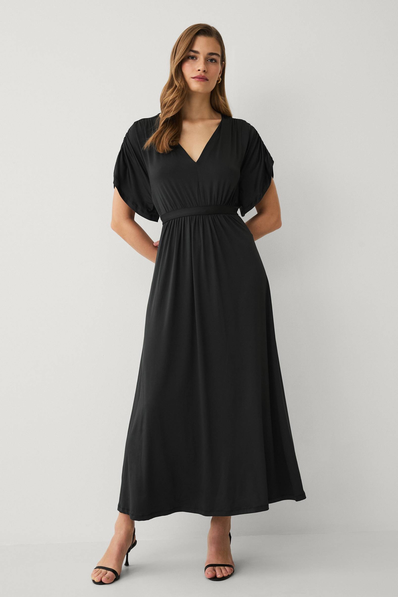 • Klänning i återvunnen, mjuk, stretchig polyester• V-formad halsringning• Dekorativt knytband i midjan• Utsvängd passform nedtill• Maxilängd• Kort kimonoärm med drapering vid axlarna• Längd: 132 cm i storlek S