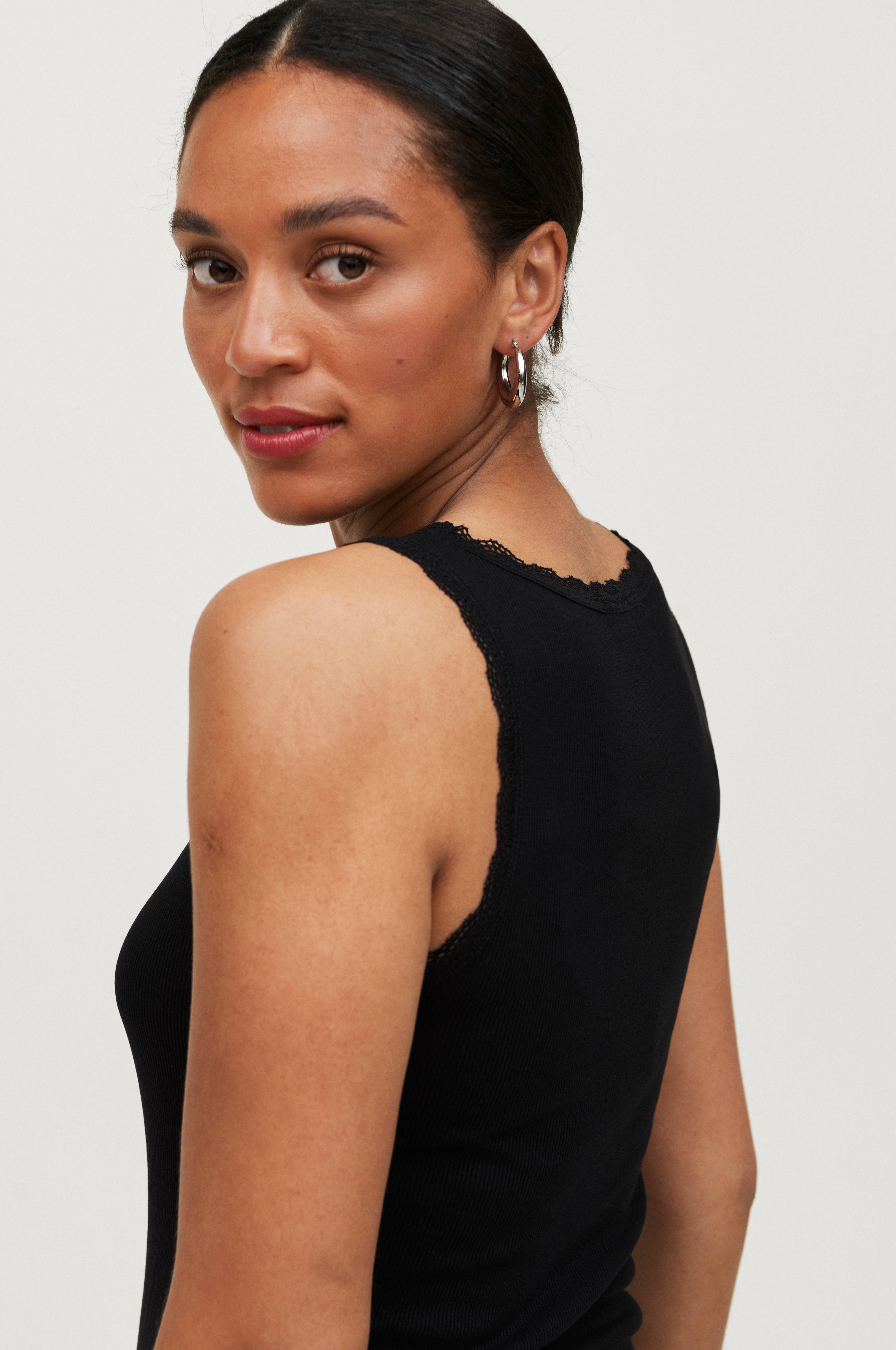 Linne Caren i mjuk, ribbad viskostrikå med spets längs halsringningen och ärmöppningarna. Smal passform. Längd ca 66 cm i stl 34/36.