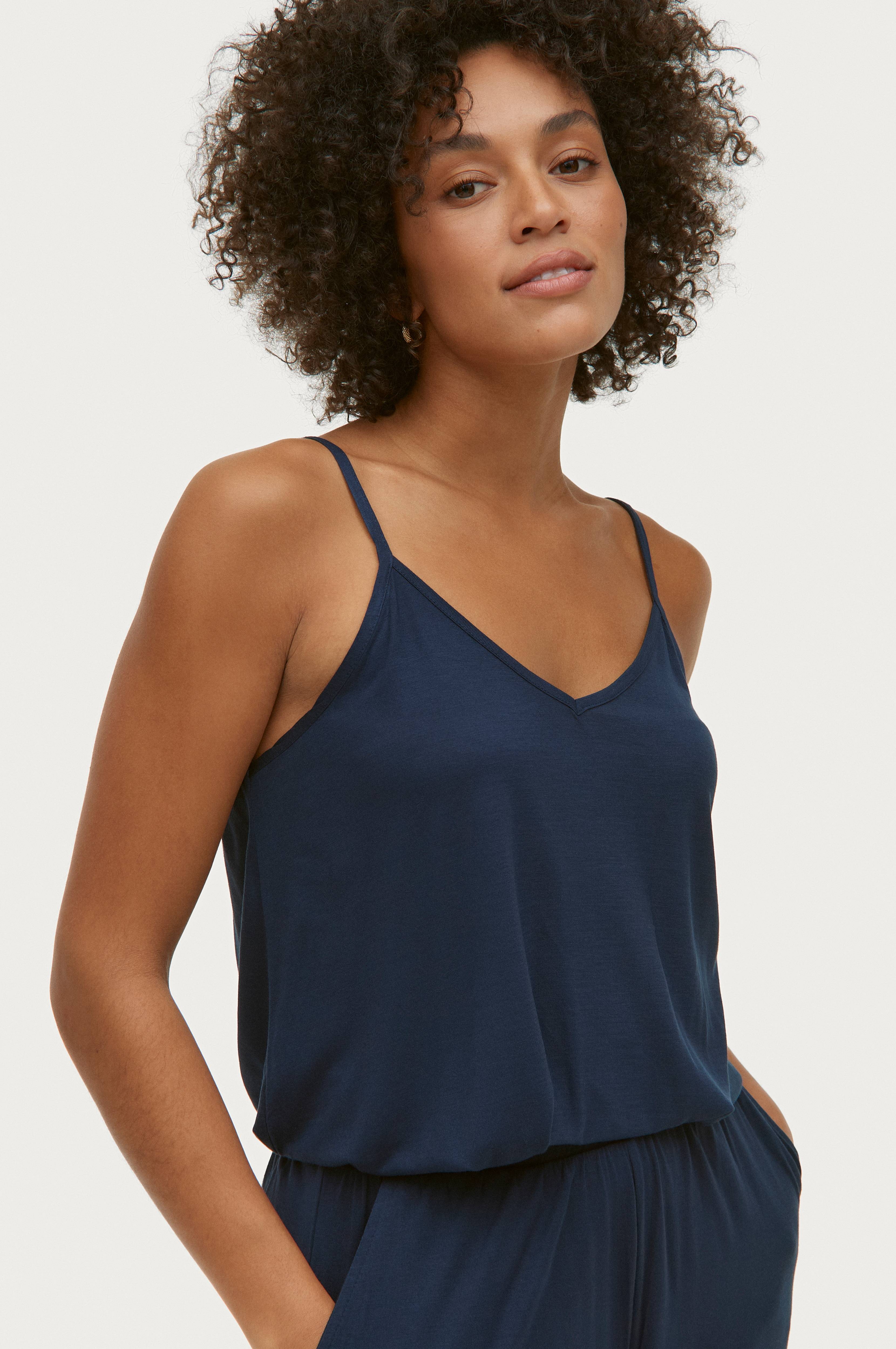Enkelt baslinne i utställd modell med smala axelband och mjuk v-ringning fram. Gjord i viskostrikå. Längd ca 62 cm i stl 34/36.