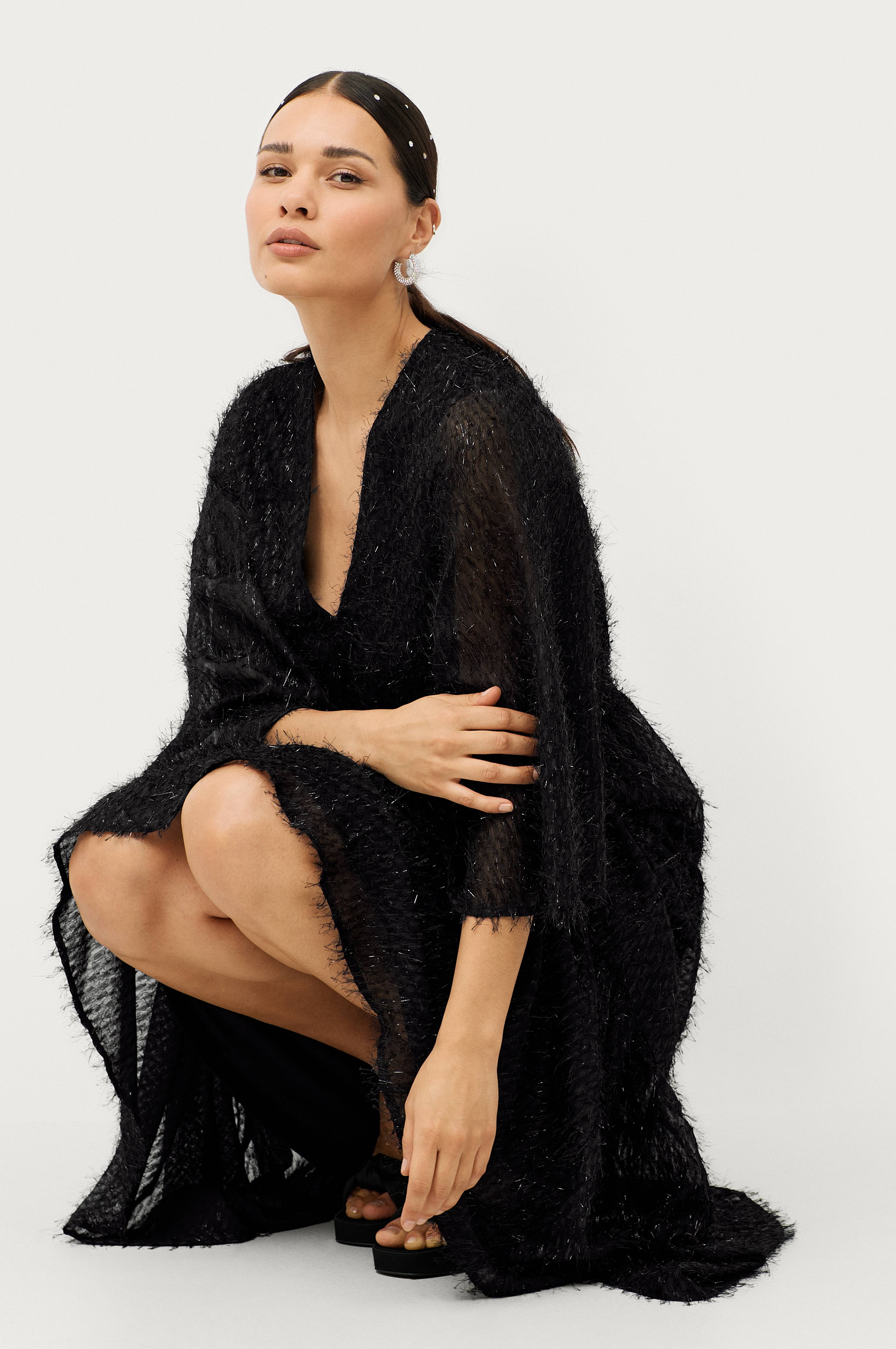 • Hellång festklänning• V-ringning• Elastisk smock i midjan• Vida, utsvängda ärmar med 3/4-längd• Gjord av chiffong med fransar• Längd: 149 cm i storlek 34/36