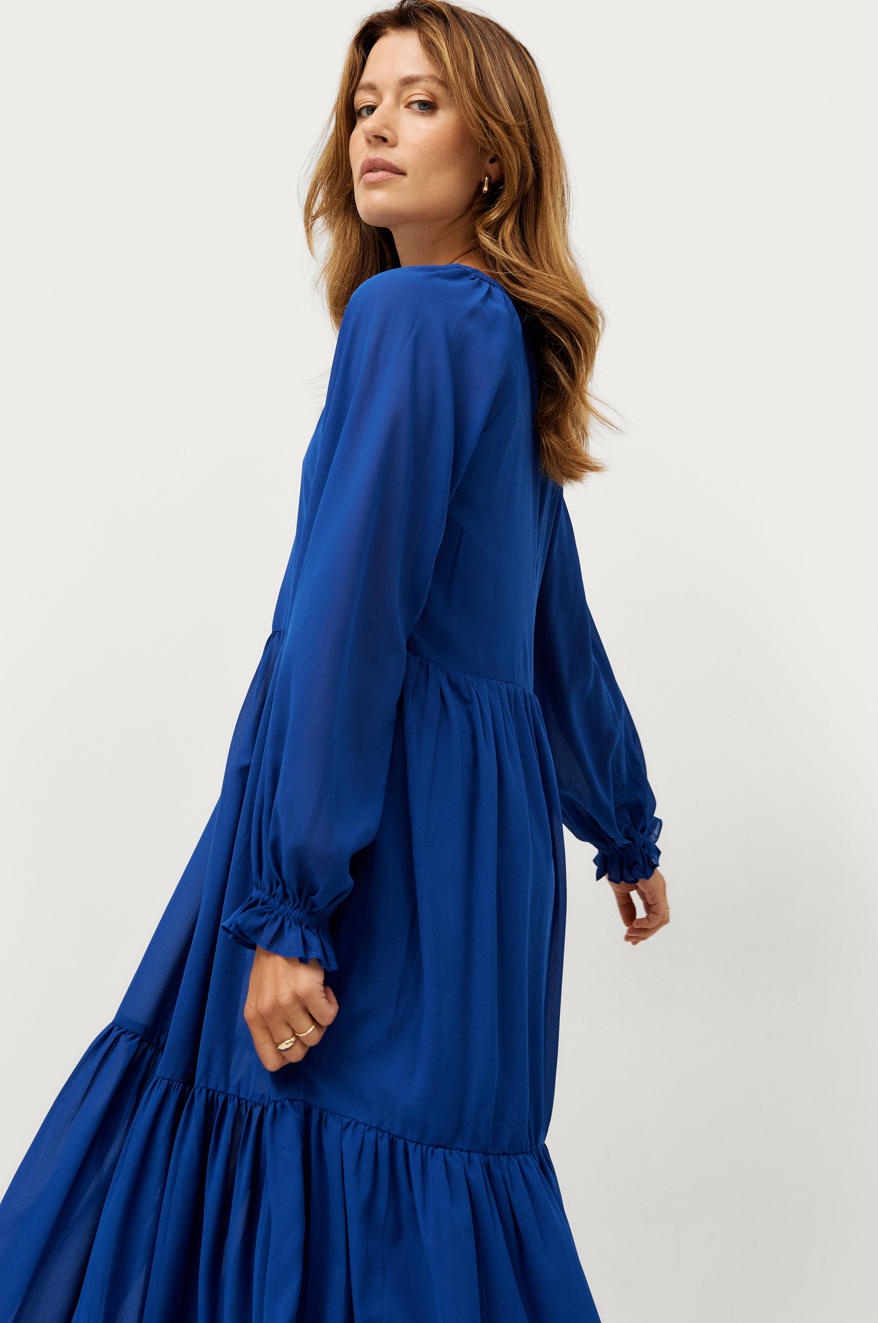 • Lång klänning i chiffong • Knappar upptill fram • Ballongärmar med resår och volang i ärmsluten • Volang nedtill • Underklänning i trikå • Längd: 133 cm i storlek 34/36 • Produkten innehåller återvunnet material som har tagits tillvara för att minska mängden avfall, samtidigt som nya resurser inte har förbrukats.