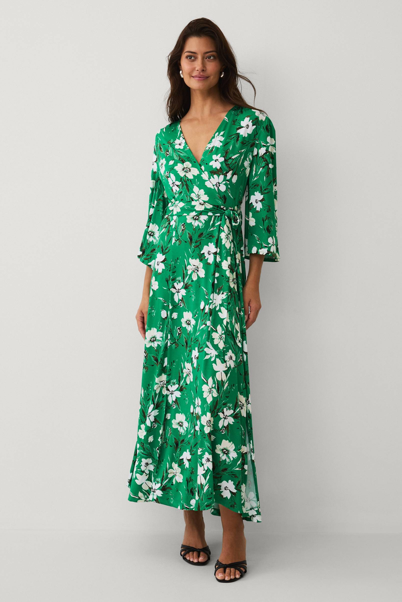• Lång klänning i trikå• V-ringad hals med omlottdesign• 3/4-långa, vida puffärmar• Avskärning i midjan med knytskärp• Utställd kjol med slitsar fram vid sidorna• Längd: 132 cm i storlek S