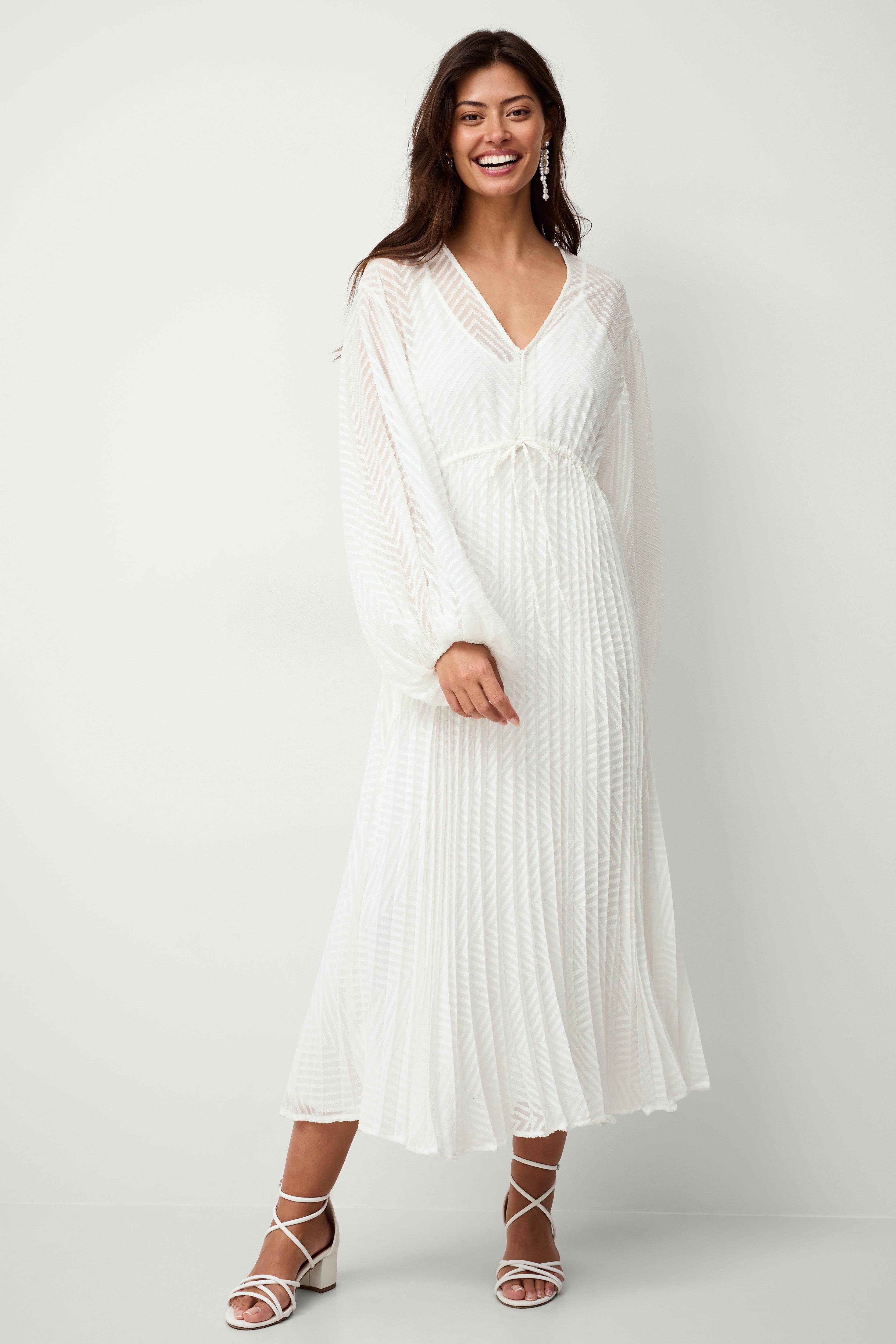 • Klänning i chiffong med vävt mönster • V-ringning • Dragsko under bysten • Plisserad kjol • Ballongärmar med elastiska ärmslut • Underklänning • Längd: 130 cm i storlek 34/36