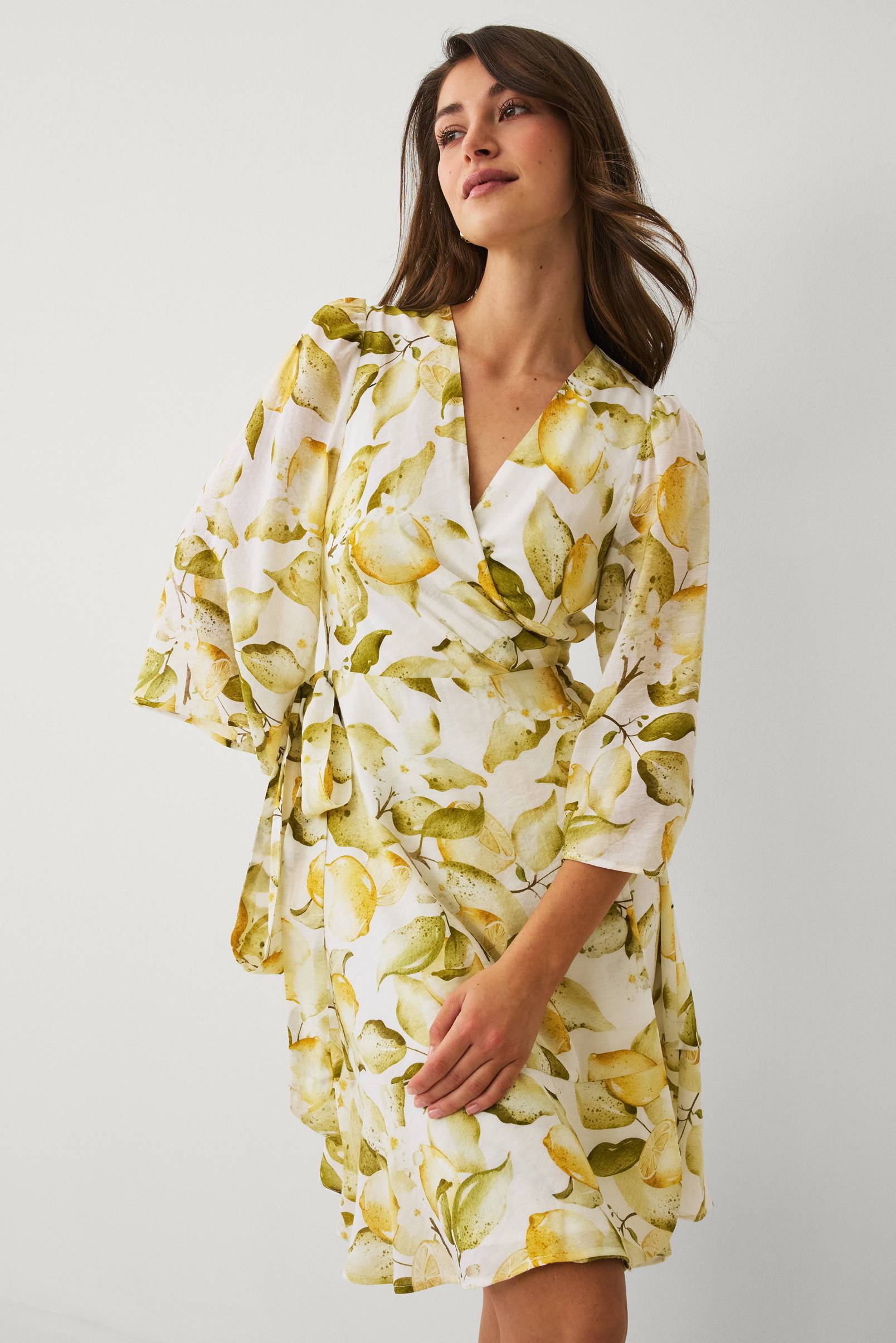 • Textilfodrad omlottklänning• V-ringning• Vida, 3/4-långa puffärmar• Resår bak i midjan• Normal passform• Längd: 106 cm i storlek 36