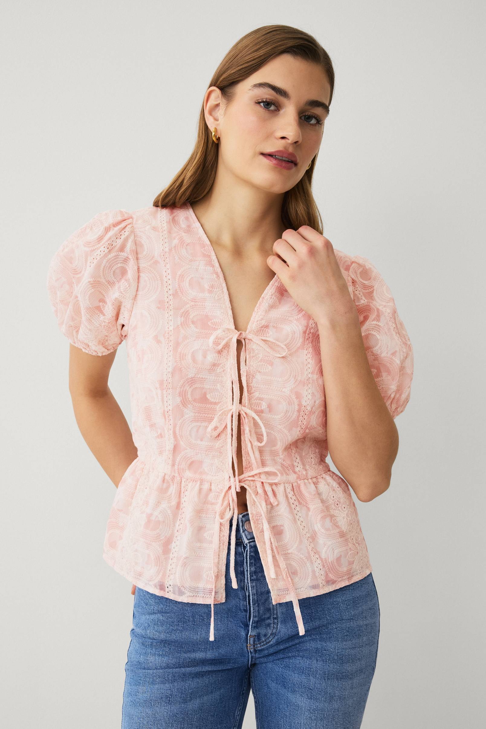 • Fodrad blus i transparent spets med peplumdesign• Korta, transparenta ballongärmar med resår i ärmsluten• Öppning med två knytband fram• Volangdesign nedtill• Längd: 59 cm i storlek 36