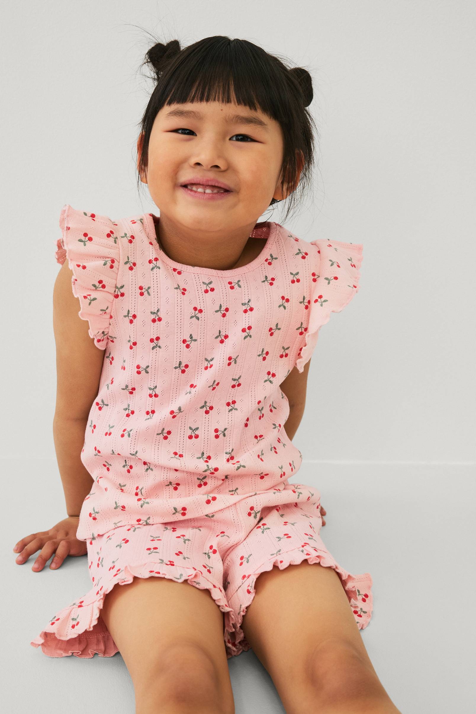 • 2-delat set i bomullstrikå med pointellemönster• Topp med korta volangärmar• Shorts med elastisk midja och volang i bensluten