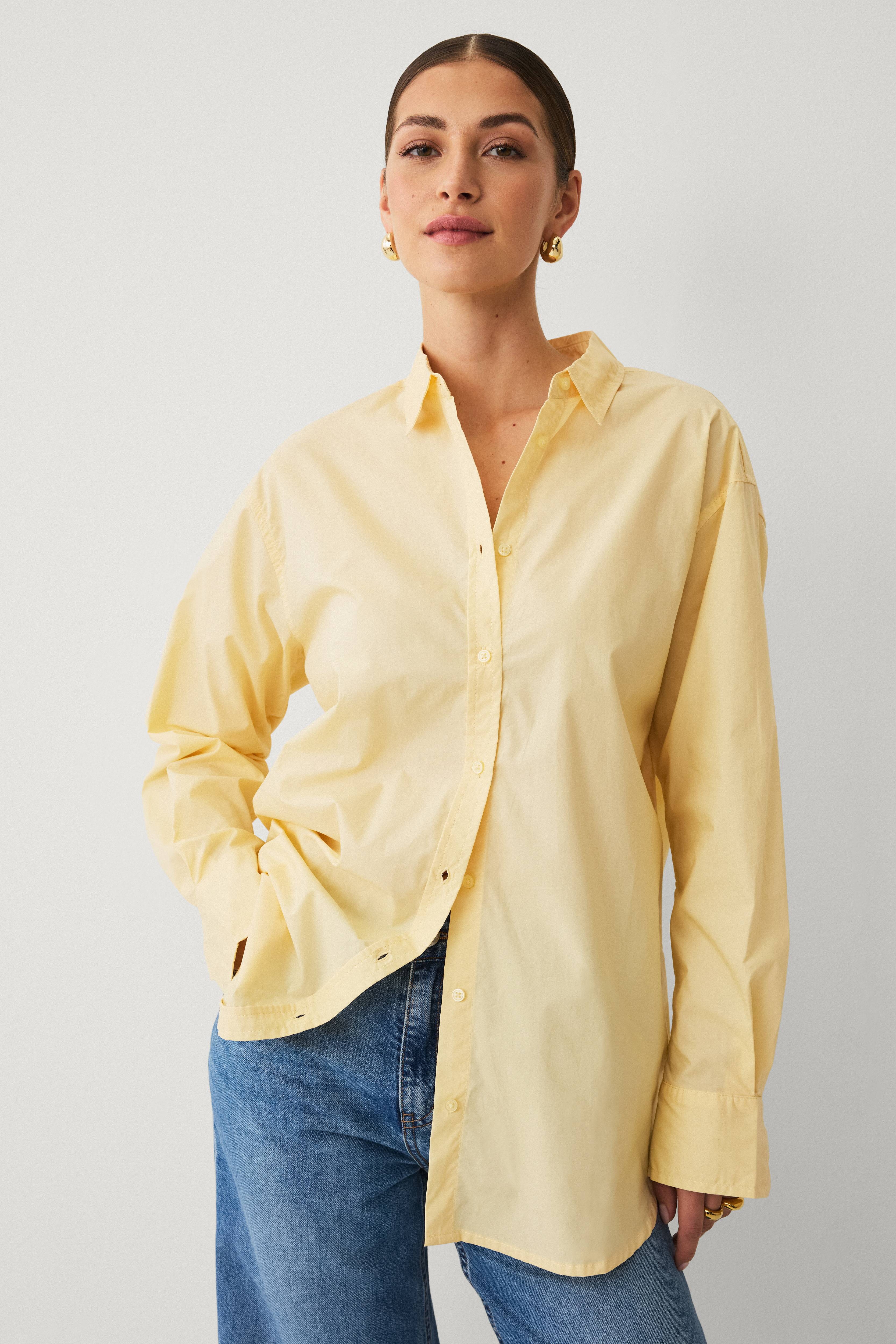 • Skjorta med avslappnad passform i bomullspoplin• Knappar fram• Manschetter med knappar i ärmsluten• Rundad nederkant med något längre baksida• Längd: 83 cm i storlek S