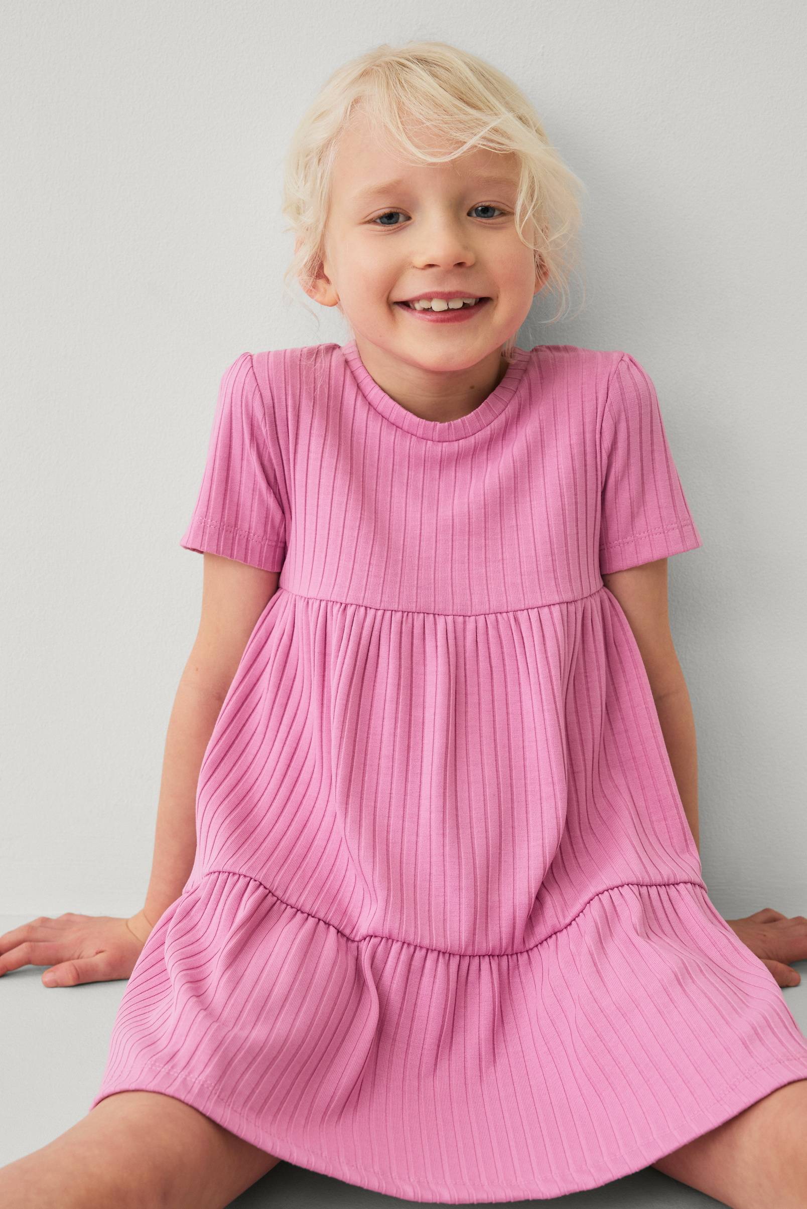 • Ribbad klänning• Rund halsringning• Korta puffärmar• Rynkad avskärning i midjan• Volang nedtill