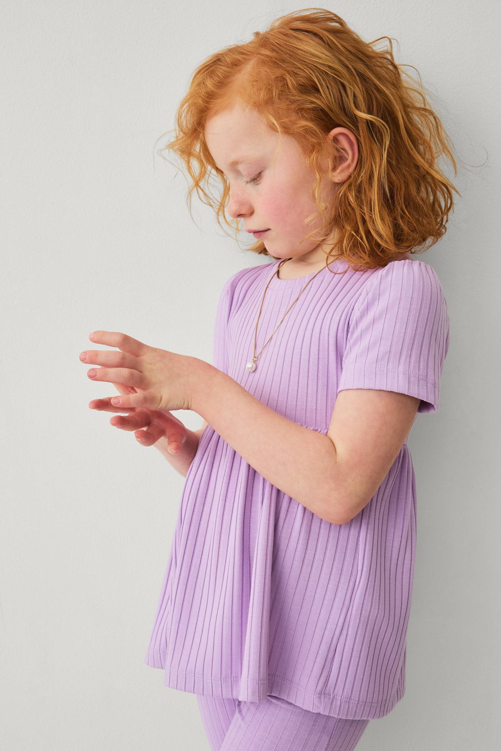 • Ribbad topp• Rund halsringning• Korta puffärmar• Rynkad avskärning i midjan
