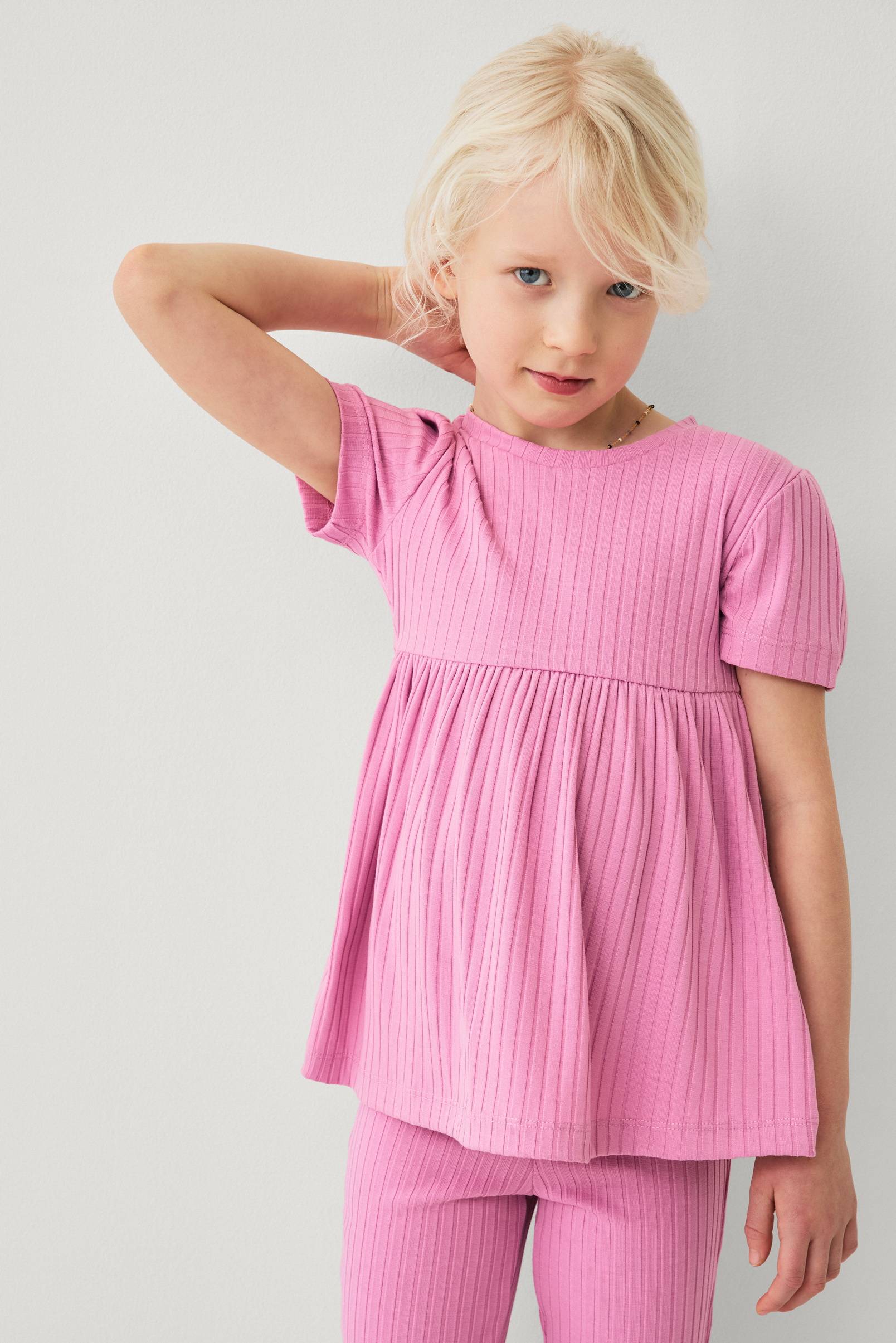 • Ribbad topp• Rund halsringning• Korta puffärmar• Rynkad avskärning i midjan