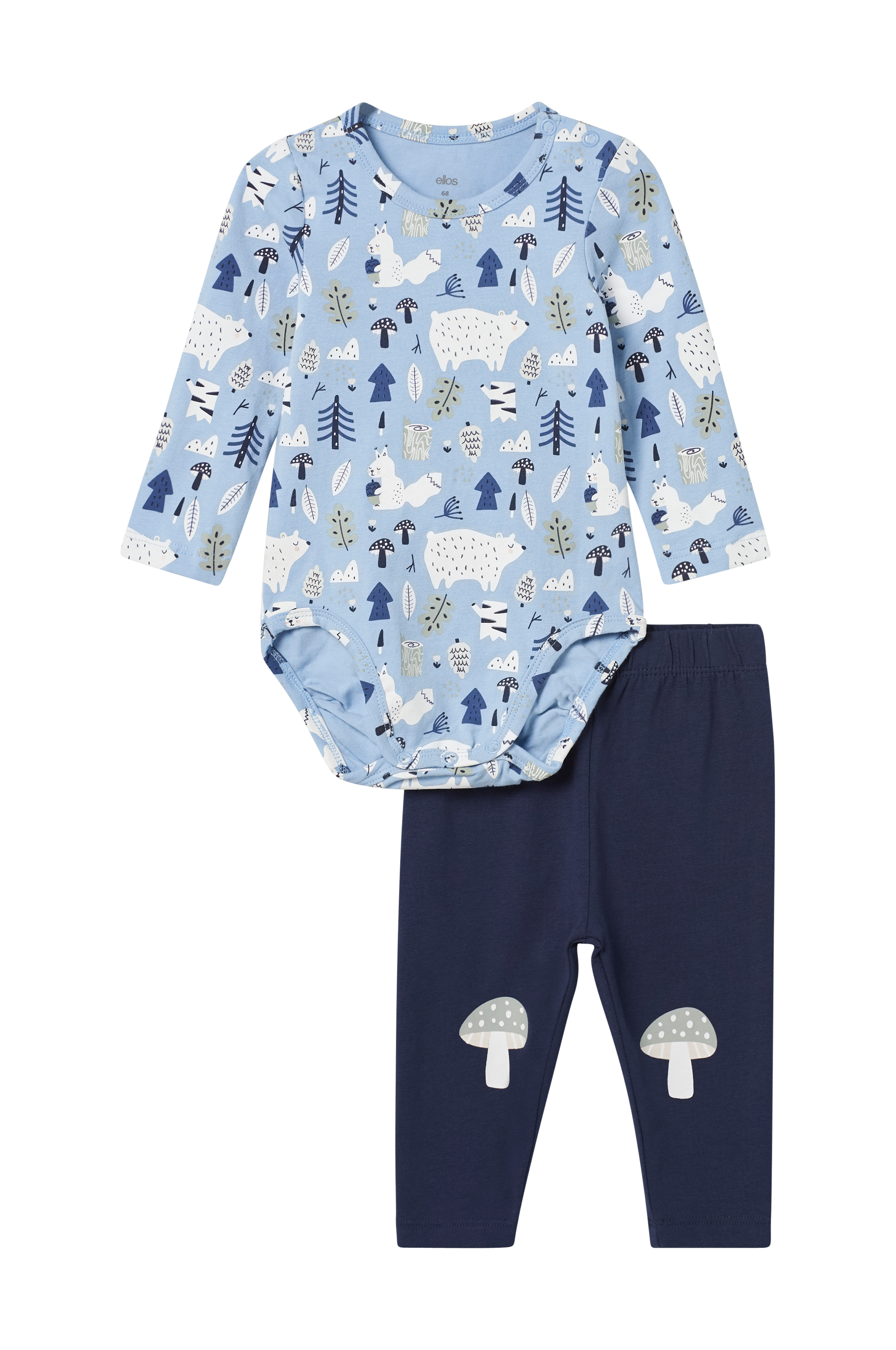 • 2-delat set i mjuk trikå• Långärmad body med tryckt mönster• Rund halsringning• Muddar i ärmsluten• Tryckknappar på ena axeln och i grenen• Leggings med elastisk midja