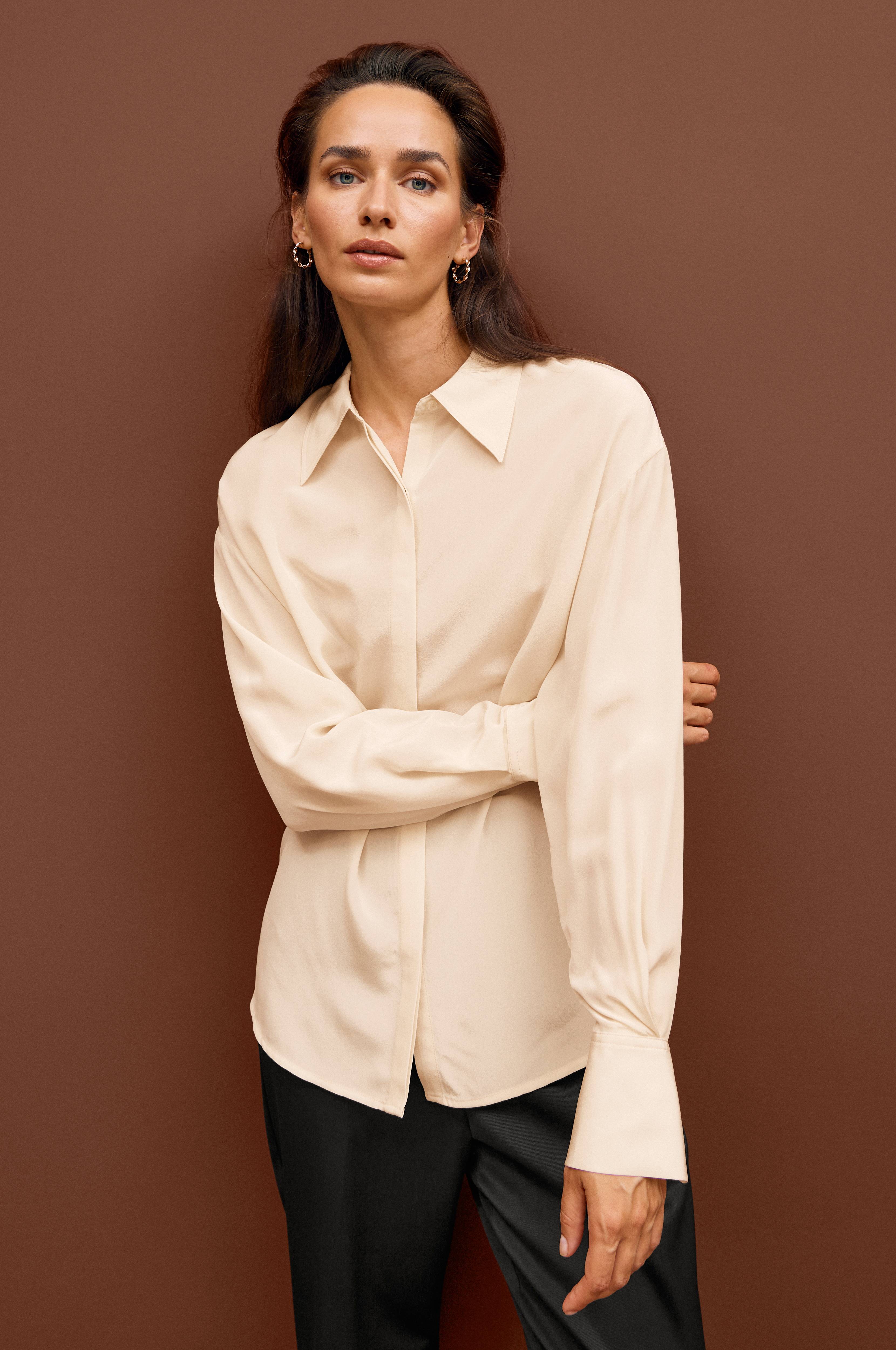 Sidenskjorta i rak modell med lite längre snibbar på kragen. Dold knäppning fram och lagt veck i ryggen. Lång ärm med bred manschett i ärmslut och rundad nederkant.