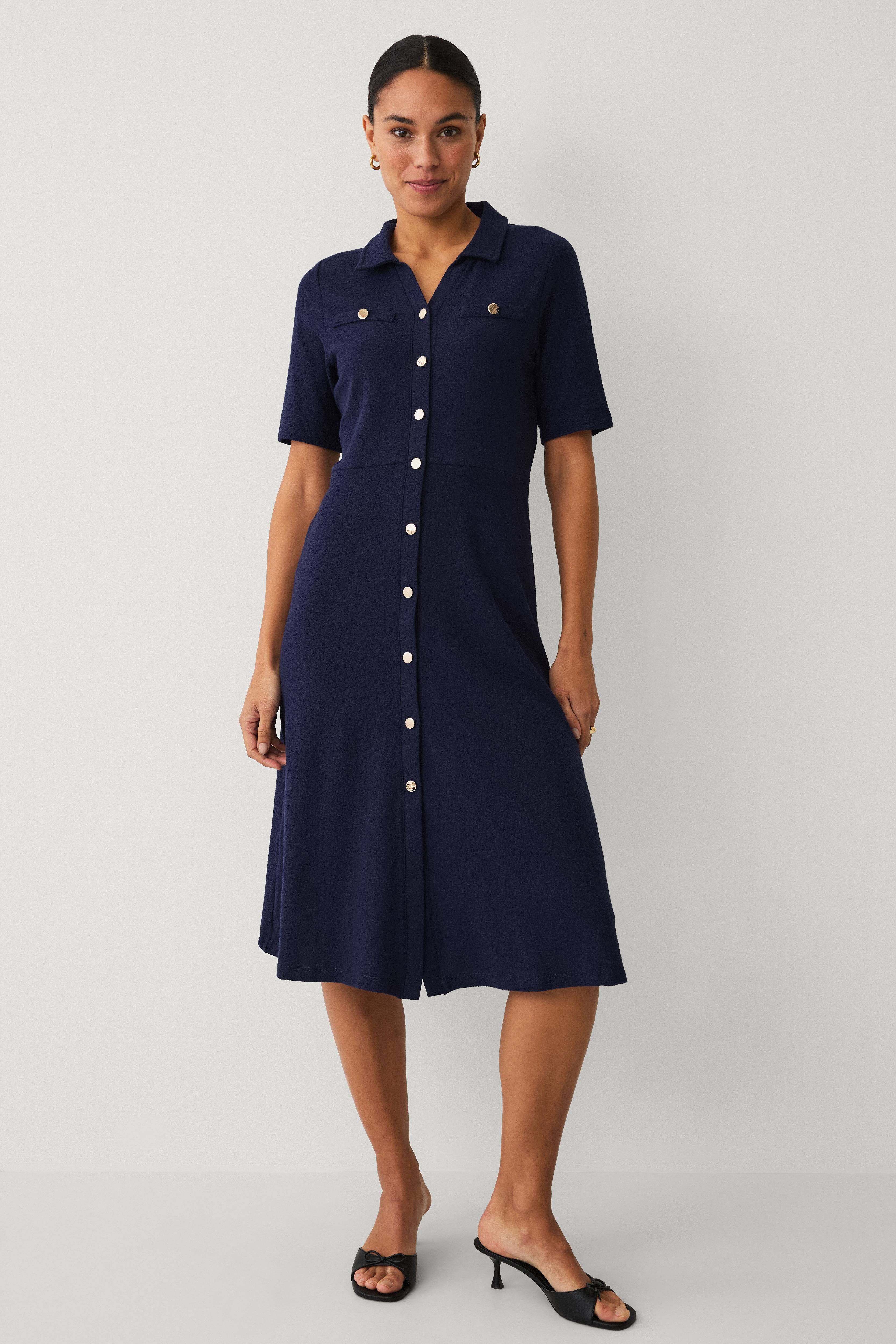 • Kortärmad klänning med struktur• Klassisk krage• Dekorativa knappar fram• Två fuskfickor med knapp fram• Utsvängd kjol• Markerad midja• Längd: 113 cm i storlek