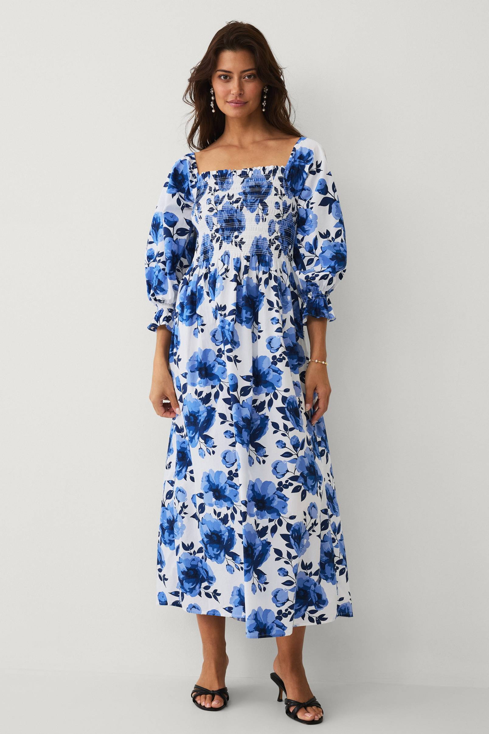 • Utsvängd maxiklänning med elastisk smock upptill• Kantig hals med volang fram och bak och invändig resår över axlarna• Vid, raglanskuren, 3/4-lång ärm med resårsömmar nedtill• Längd: 130 cm i storlek S