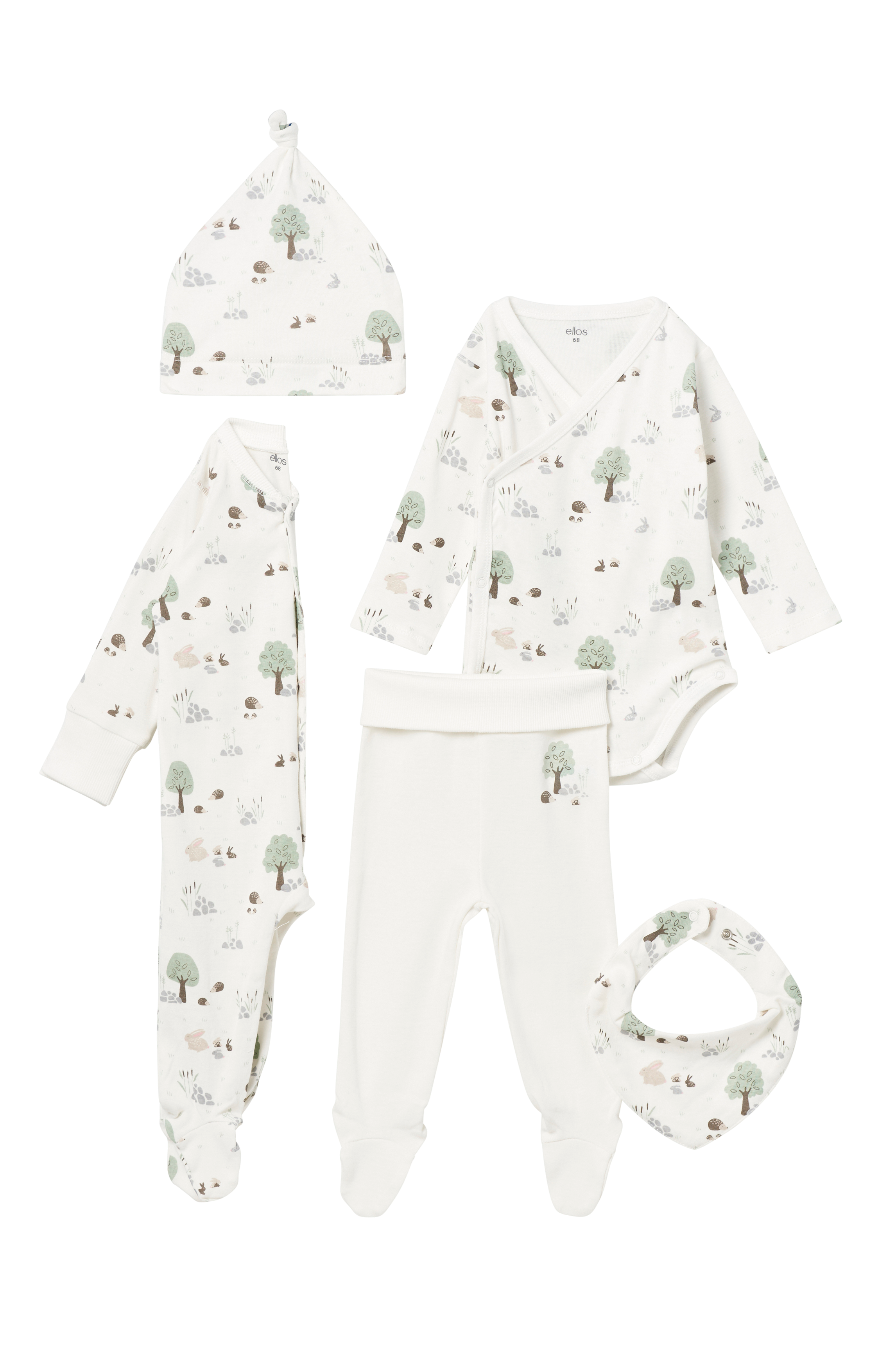 Startpaket eller gåvoset i 5 delar för barnets första tid. Plaggen är gjorda i mjuk trikå av ekologisk bomull.