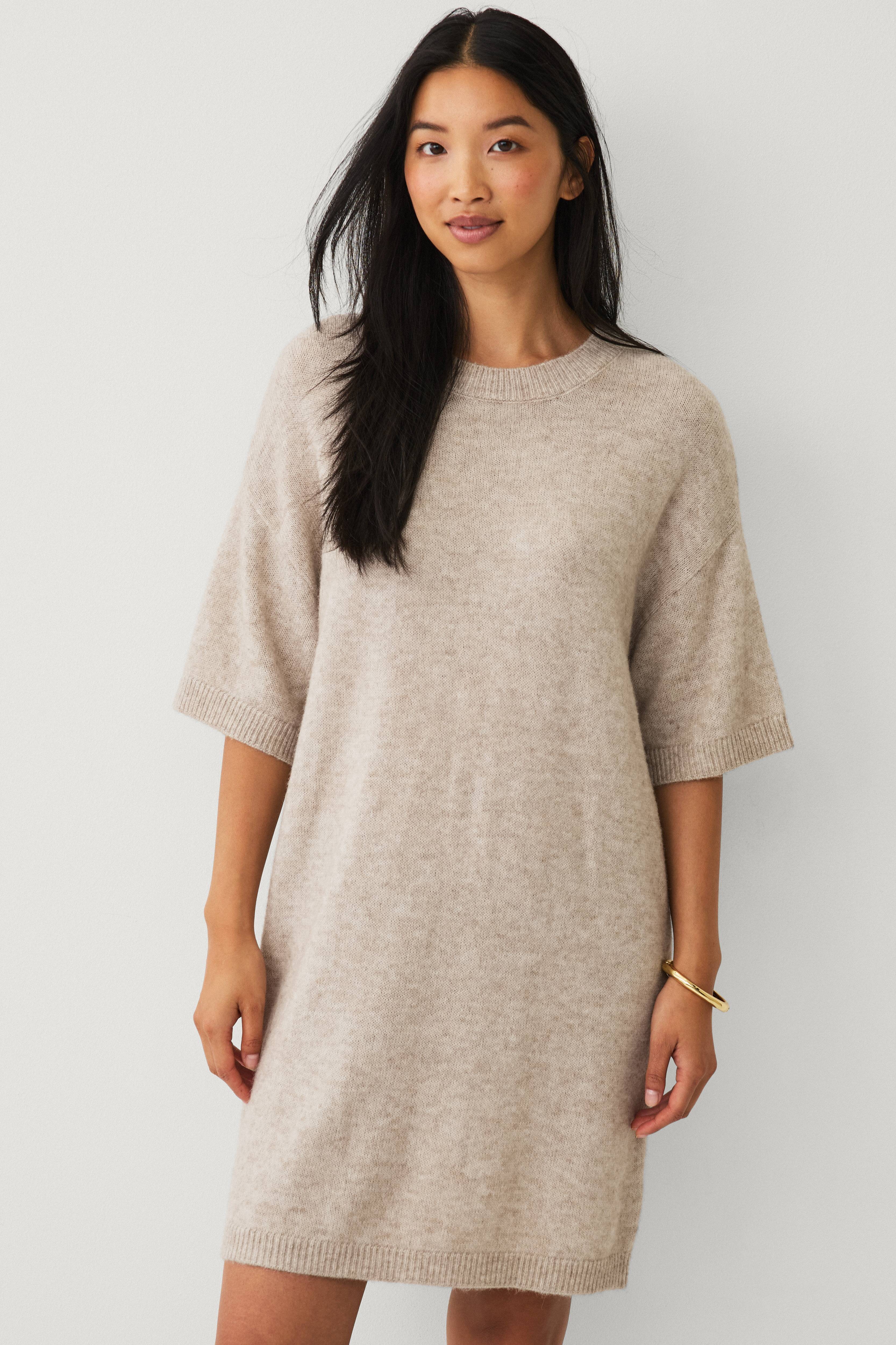 • Slätstickad, kortärmad klänning• Avslappnad passform• Rund halsringning• Ribbstickning vid halsringningen, i ärmsluten och nedtill• Längd: 85 cm i storlek S