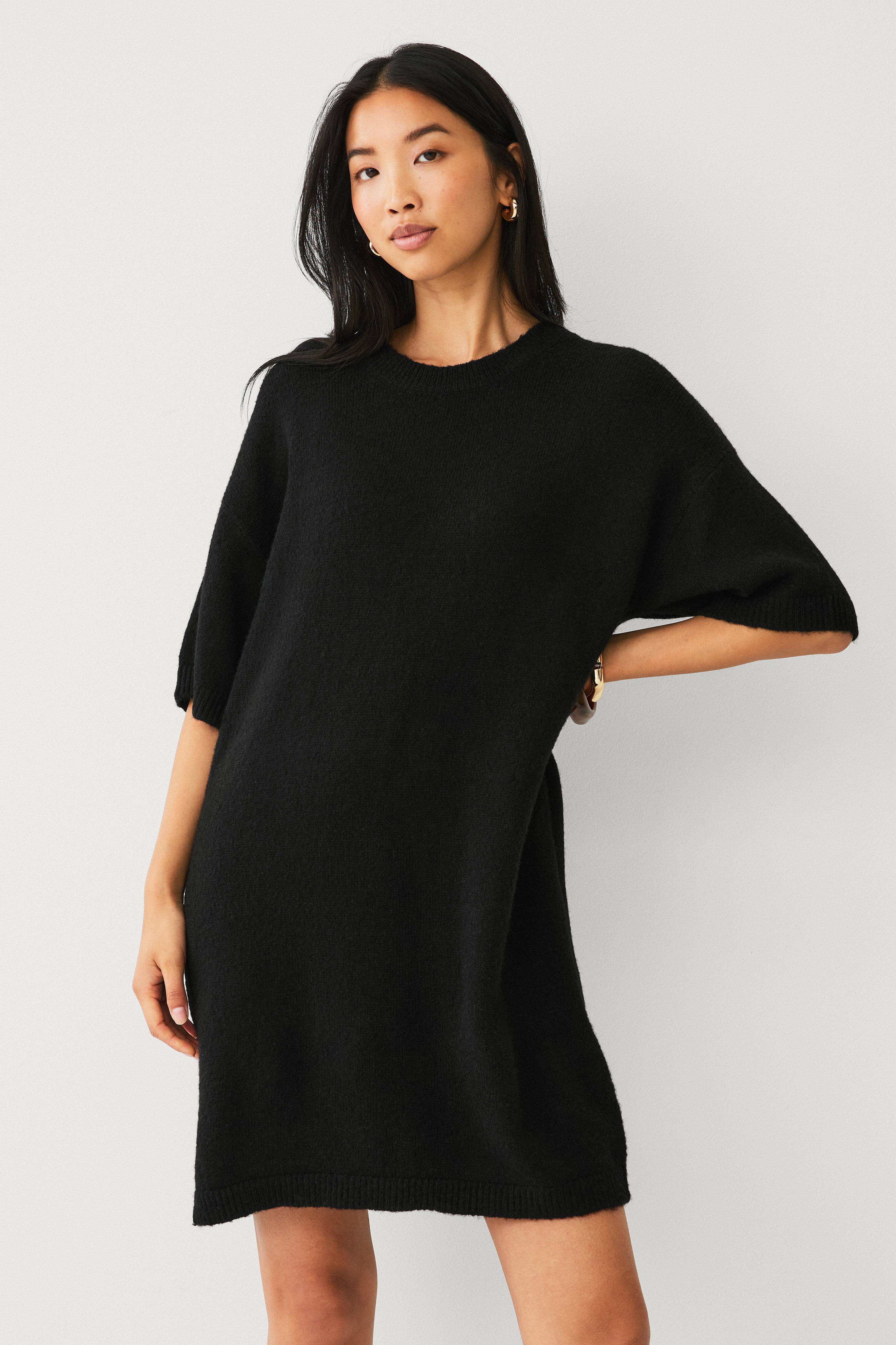 • Slätstickad, kortärmad klänning• Avslappnad passform• Rund halsringning• Ribbstickning vid halsringningen, i ärmsluten och nedtill• Längd: 85 cm i storlek S