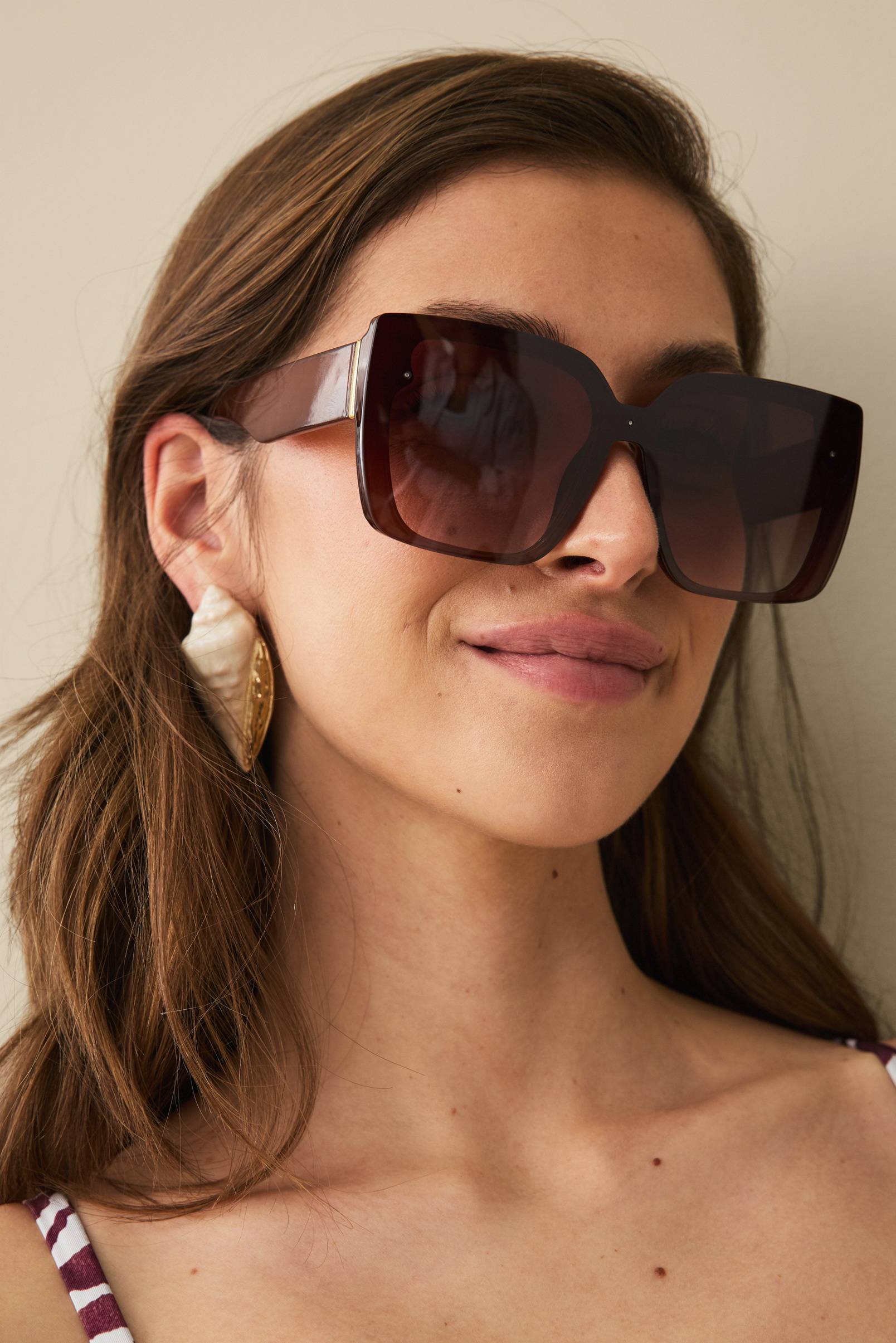 • Stora solglasögon med fyrkantig design• Grov båge med guldfärgad detalj• Tonade plastglas• Bredd: 14 cm