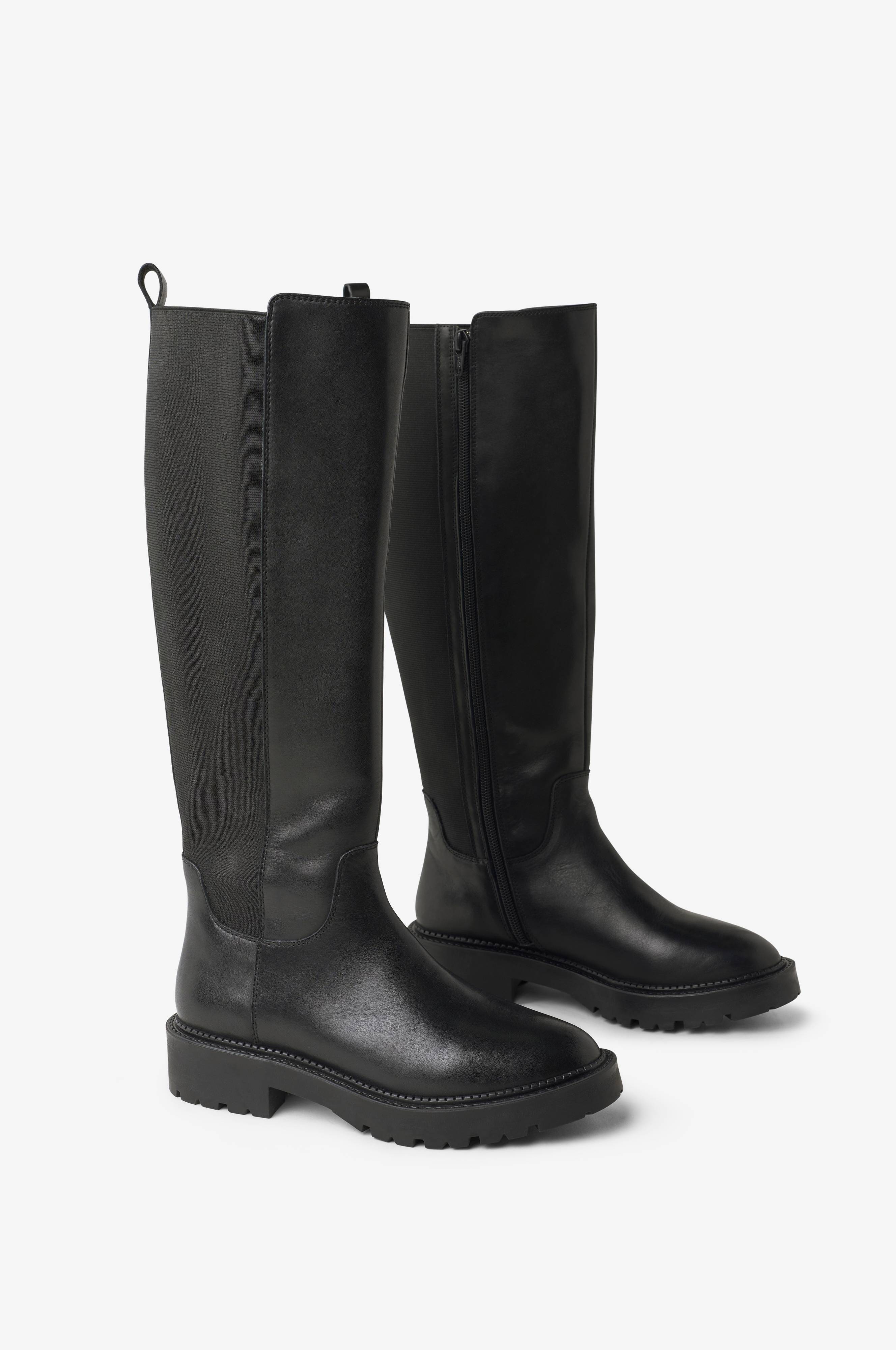 Stövlar i skinn med breda resårpaneler på båda sidor och baktill på skaftet. Textilfoder. Kraftig yttersula i gummi med klack. Dragkedja på skaftets insida. Klackhöjd ca 4 cm.