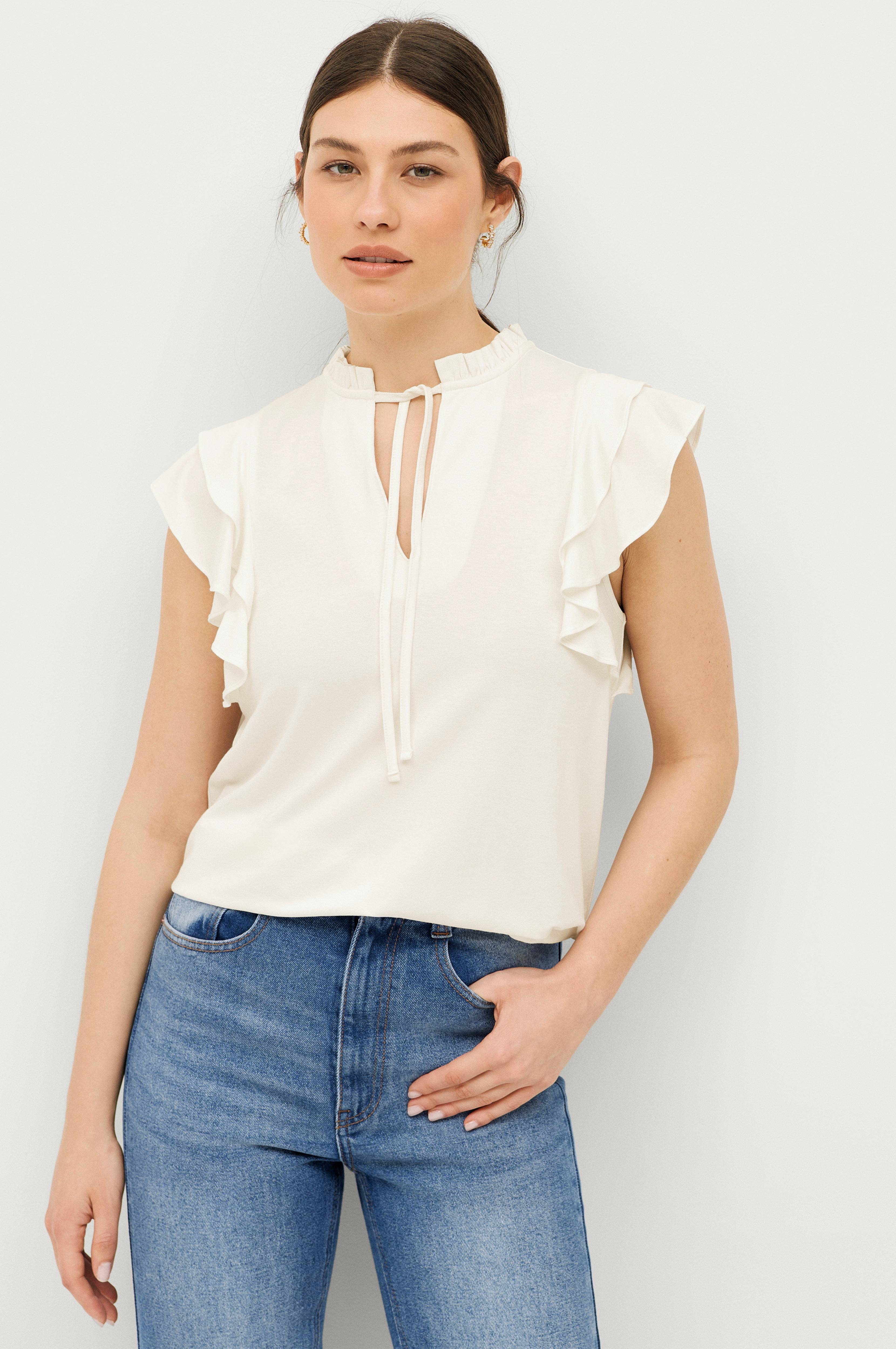 • Topp i viskostrikå• Korta volangärmar• Volang vid halsringningen• Sprund med knytband fram• Längd: 65 cm i storlek 34/36